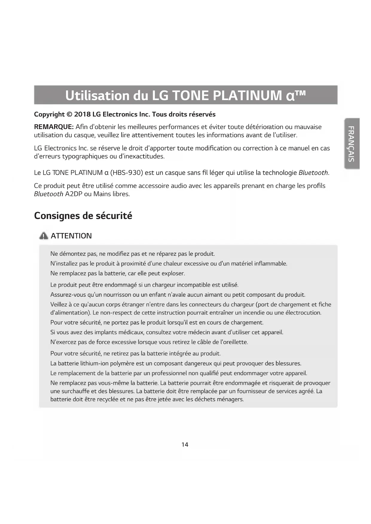 MODE D'EMPLOI Tone Platinum Alpha HBS930 LG