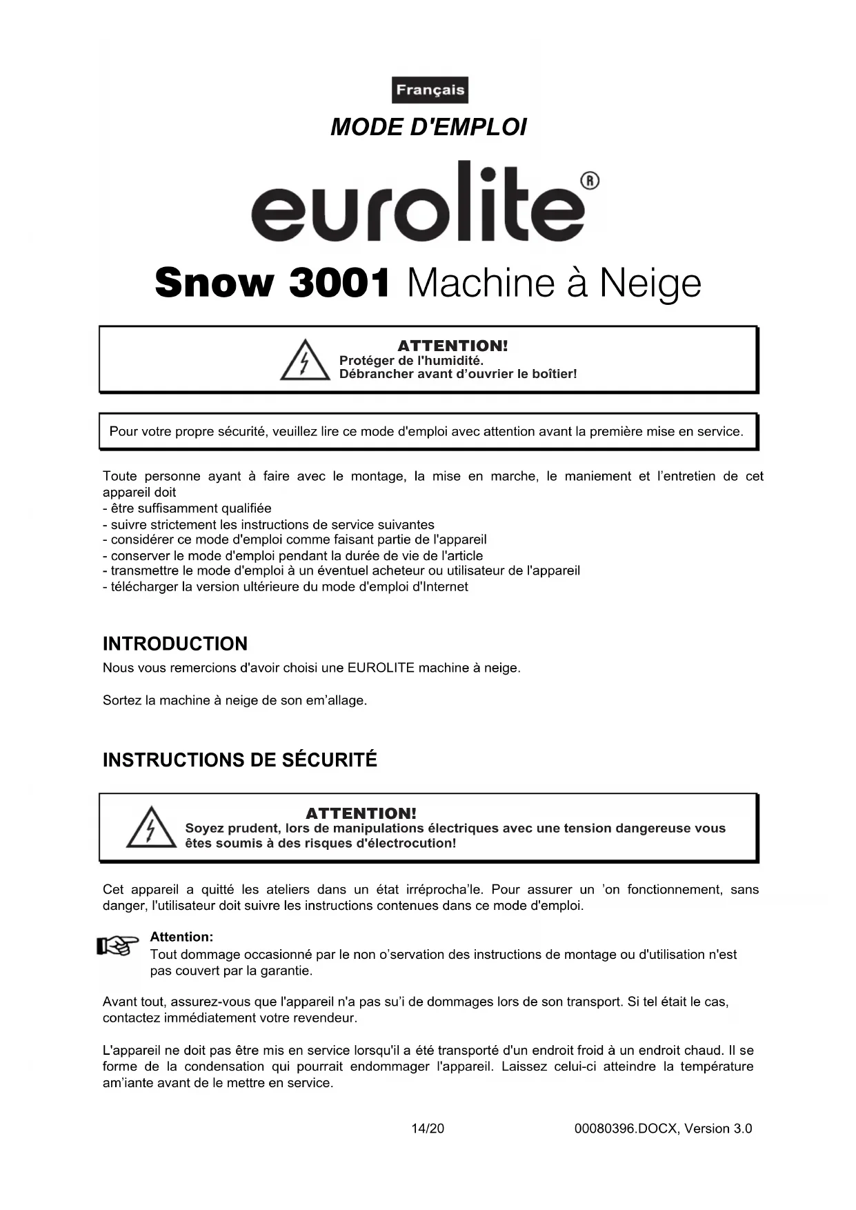 Retrouvez gratuitement la notice de l'appareil Snow 3001 Eurolite au format PDF.