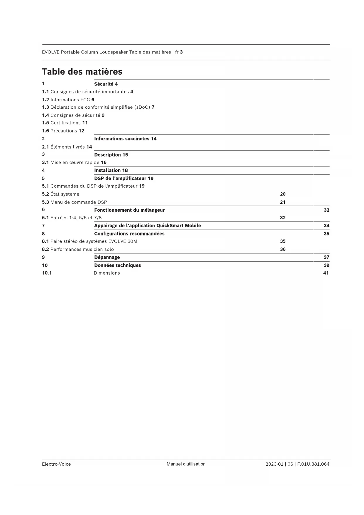 Remarque! Bluetooth® est disponible dans certains pays. Contactez votre revendeur Electro-Voice ou distributeur Electro-Voice le plus proche pour plus d’informations. La marque et les logos Bluetooth® sont des marques déposées de Bluetooth SIG, Inc. et leur utilisation par Bosch Security Systems, Inc. fait l'objet d'un accord de licence. Les autres marques et noms commerciaux sont ceux de leurs propriétaires respectifs. Convient pour la Chine: CHINA ROHS DISCLOSURE TABLEEVOLVE Portable Column Loudspeaker Sécurité | fr 13 Electro-Voice Manuel d'utilisation 2023-01 | 06 | F.01U.381.06414 fr | Informations succinctes EVOLVE Portable Column Loudspeaker 2023-01 | 06 | F.01U.381.064 Manuel d'utilisation Electro-Voice 2 Informations succinctes Le tableau suivant répertorie les produits d'une gamme, avec la référence commerciale (CTN, Commercial Type Number) et la DESCRIPTION du nom de produit d'identification. Référence CTN Description EVOLVE30M-US Système de colonne portable, version États-Unis, noir EVOLVE30M-EU Système de colonne portable, version UE AP, noir EVOLVE30M-W Système de colonne portable, international, blanc EVOLVE30M-SUBCVR Housse souple pour caisson EVOLVE30M EVOLVE-CASE Valise de transport pour EVOLVE 30M & 50