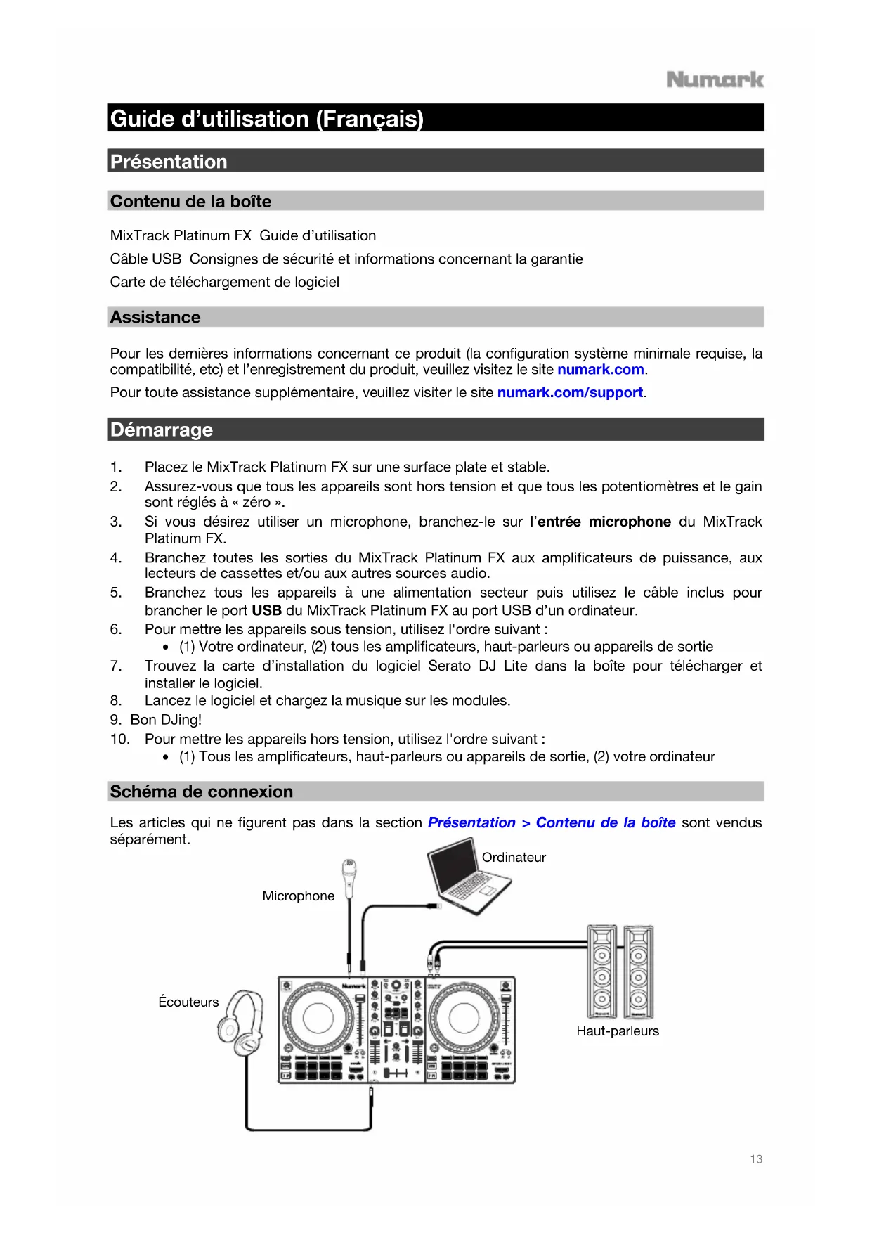 Guide d’utilisation (Français) Présentation Contenu de la boîte MixTrack Platinum FX Guide d’utilisation Câble USB Consignes de sécurité et informations concernant la garantie Carte de téléchargement de logiciel Assistance Pour les dernières informations concernant ce produit (la configuration système minimale requise, la compatibilité, etc) et l’enregistrement du produit, veuillez visitez le site numark.com. Pour toute assistance supplémentaire, veuillez visiter le site numark.com/support. Démarrage