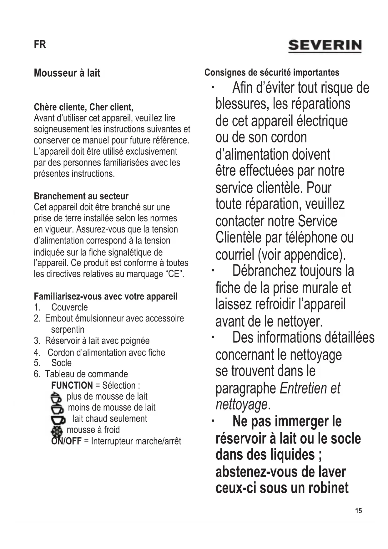 Mousseur à lait Chère cliente, Cher client, Avant d’utiliser cet appareil, veuillez lire soigneusement les instructions suivantes et conserver ce manuel pour future référence. L’appareil doit être utilisé exclusivement par des personnes familiarisées avec les présentes instructions. Branchement au secteur Cet appareil doit être branché sur une prise de terre installée selon les normes en vigueur. Assurez-vous que la tension d’alimentation correspond à la tension indiquéesurlachesignalétiquede l’appareil. Ce produit est conforme à toutes les directives relatives au marquage “CE”. Familiarisez-vous avec votre appareil