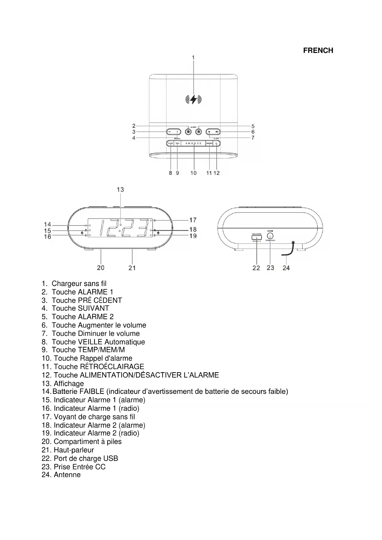 Réglage de l’heure de l’alarme: Utilisez la touche RETOUR RAPIDE pour régler les heures et la touche AVANCE RAPIDE pour régler les minutes. Réglage de la source sonore de l’alarme: Utilisez les touches AVANCE RAPIDE et RETOUR RAPIDE pour sélectionner la sonnerie ou la radio comme source d’alarme. Le voyant d’alarme correspondant s’allume en fonction de votre sélection. Une fois le réglage de l’alarme terminé, l’alarme sera automatiquement activée avec le voyant d’alarme correspondant allumé (alarme ou radio).Activer ou désactiver les alarmes Lorsque l’heure de l’horloge s’affiche, appuyez sur la touche ALARME 1 ou ALARME 2 pour activer ou désactiver l’alarme respective. Le voyant d’alarme 1 ou d’alarme 2 correspondant (alarme ou radio) s’allume lorsque l’alarme est activée. Désactivation de l'alarme sonore Appuyez sur la touche DÉSACTIVER L'ALARME pour arrêter une alarme déclenchée. Lorsque l’alarme sonne, le voyant d’alarme 1 ou d’alarme 2 correspondant (alarme ou radio) clignote sur l’écran. Réglage du mode Rappel d'alarme Pour désactiver temporairement une alarme sonore, appuyez sur la touche RAPPEL D’ALARME. L'alarme retentira à nouveau quand la période de repos est passée (9 minutes). Le voyant d’alarme 1 ou d’alarme 2 correspondant (alarme ou radio) clignote sur l’écran pendant la période de répétition. Pour annuler la période de répétition et l’alarme, appuyez sur la touche DÉSACTIVER L’ALARME. Réglage du mode veille automatique Cette fonction définit la durée avant que la radio ne s’éteigne automatiquement. Quand la radio est allumée, appuyer plusieurs fois sur VEILLE AUTOMATIQUE pour sélectionner une période de Veille automatique (options : 90, 80, 70, 60, 50, 40, 30, 20, 10 minutes et DÉSACTIVÉ ). La radio s'éteint automatiquement dès que le délai de la veille automatique est écoulé. Appuyez sur VEILLE AUTOMATIQUE pour voir le temps restant avant que la radio ne s'éteigne. Appuyez sur ALIMENTATION pour annuler cette fonction. Utilisation de la charge sans fil Qi IL EST SUGGÉ RÉ DE CHARGER VOTRE TÉLÉ PHONE AVEC UN CÂBLE FILAIRE AU LIEU D’UN CHARGEUR SANS FIL PENDANT LA MISE À JOUR DU LOGICIEL DU TÉLÉ PHONE. AUTREMENT, CHARGEZ VOTRE TÉLÉPHONE ENTIÈREMENT AVANT LA MISE À JOUR DU LOGICIEL DU TÉLÉ PHONE. Placez votre smartphone compatible Qi au milieu de la zone de charge sans fil. Pour une meilleure connectivité, alignez votre téléphone avec le réveil.Voyant de charge sans fil Le voyant indicateur de charge sans fil s’affiche dans le coin supérieur droit de l’écran du produit. Reportez-vous aux indicateurs d’état de voyants ci-dessous :