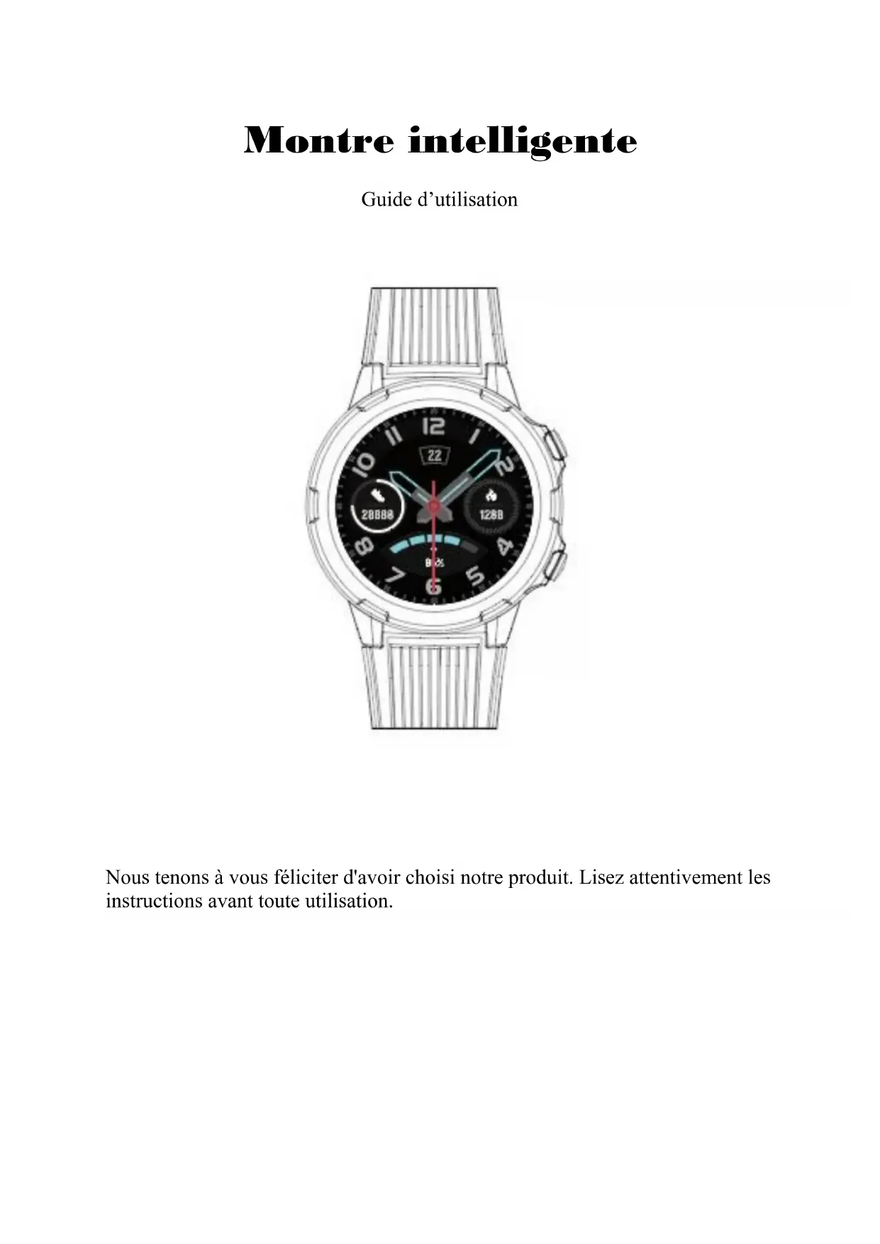 Montre intelligente Guide d’utilisation Nous tenons à vous féliciter d'avoir choisi notre produit. Lisez attentivement les instructions avant toute utilisation.Pour commencer