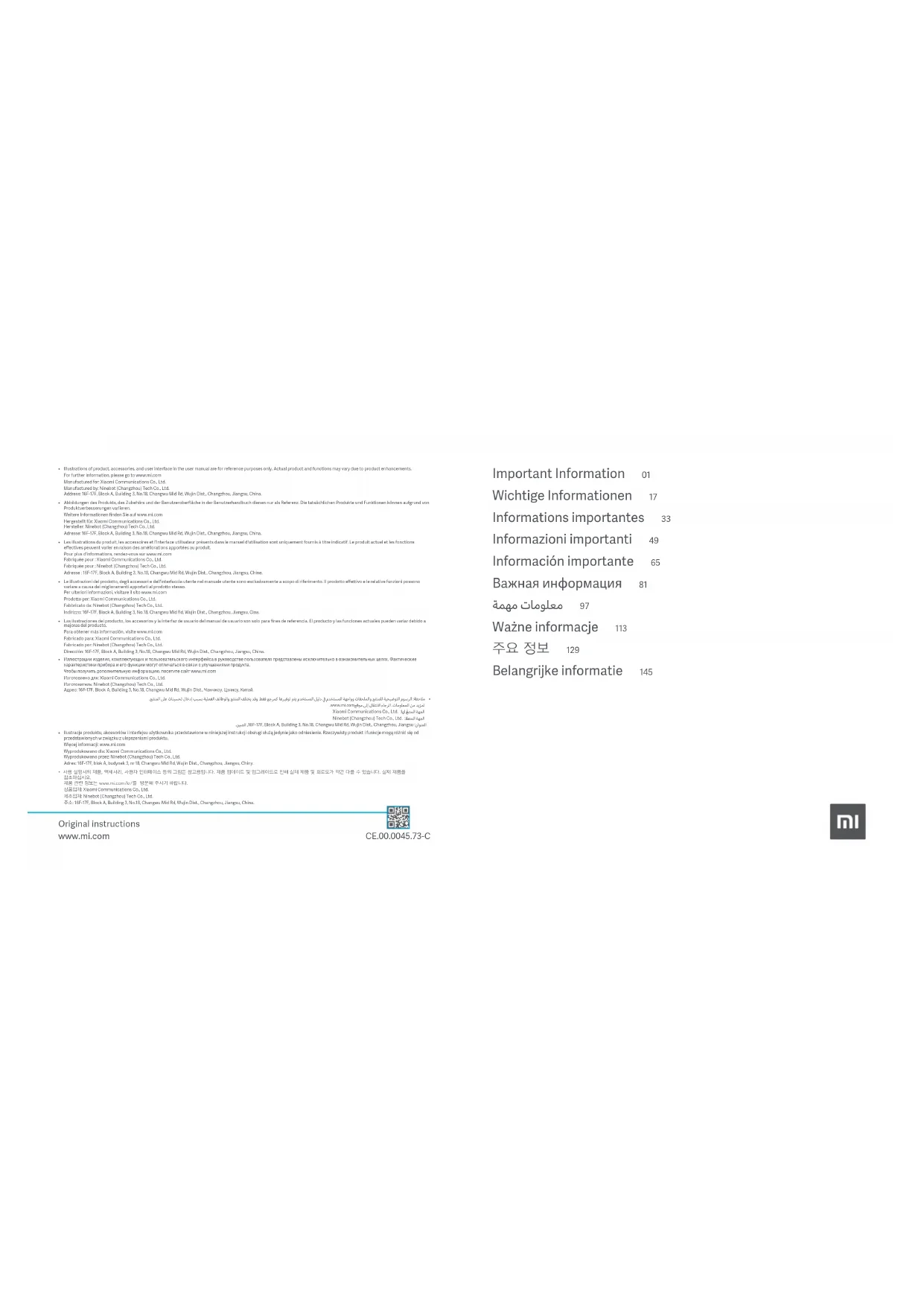 - Les illustrations du produit, les accessoires et l’interface utilisateur présents dans le manuel d'utilisation sont uniquement fournis à titre indicatif. Le produit actuel et les fonctions effectives peuvent varier en raison des améliorations apportées au produit.Pour plus d’informations, rendez-vous sur www.mi.comFabriquée pour : Xiaomi Communications Co., Ltd.Fabriquée pour : Ninebot (Changzhou) Tech Co., Ltd.Adresse : 16F-17F, Block A, Building 3, No.18, Changwu Mid Rd, Wujin Dist., Changzhou, Jiangsu, Chine.