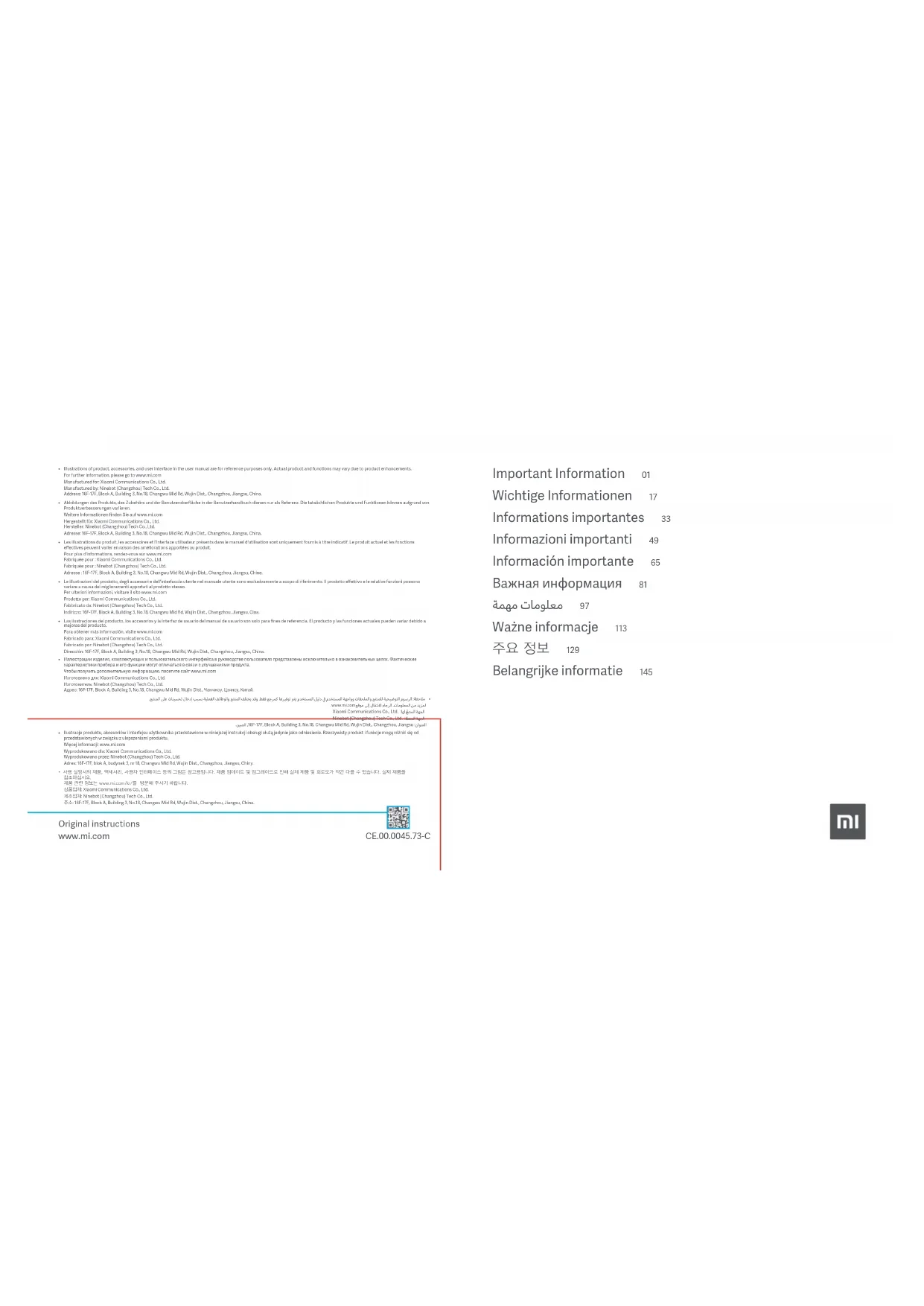 - Les illustrations du produit, les accessoires et l’interface utilisateur présents dans le manuel d'utilisation sont uniquement fournis à titre indicatif. Le produit actuel et les fonctions effectives peuvent varier en raison des améliorations apportées au produit.Pour plus d’informations, rendez-vous sur www.mi.comFabriquée pour : Xiaomi Communications Co., Ltd.Fabriquée pour : Ninebot (Changzhou) Tech Co., Ltd.Adresse : 16F-17F, Block A, Building 3, No.18, Changwu Mid Rd, Wujin Dist., Changzhou, Jiangsu, Chine.