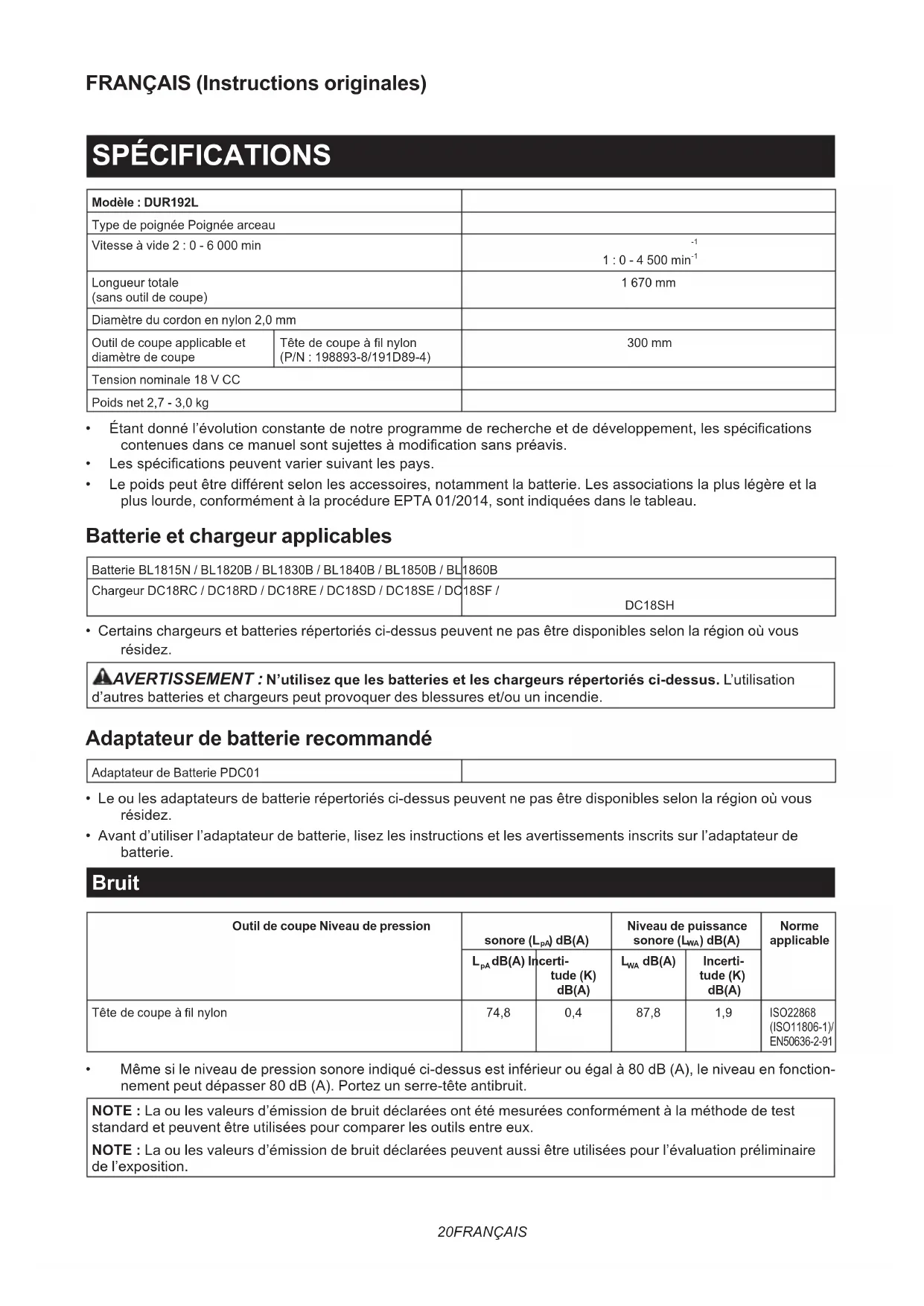 - Avant d’utiliser l’adaptateur de batterie, lisez les instructions et les avertissements inscrits sur l’adaptateur de batterie. Bruit Outil de coupe Niveau de pression sonore (L