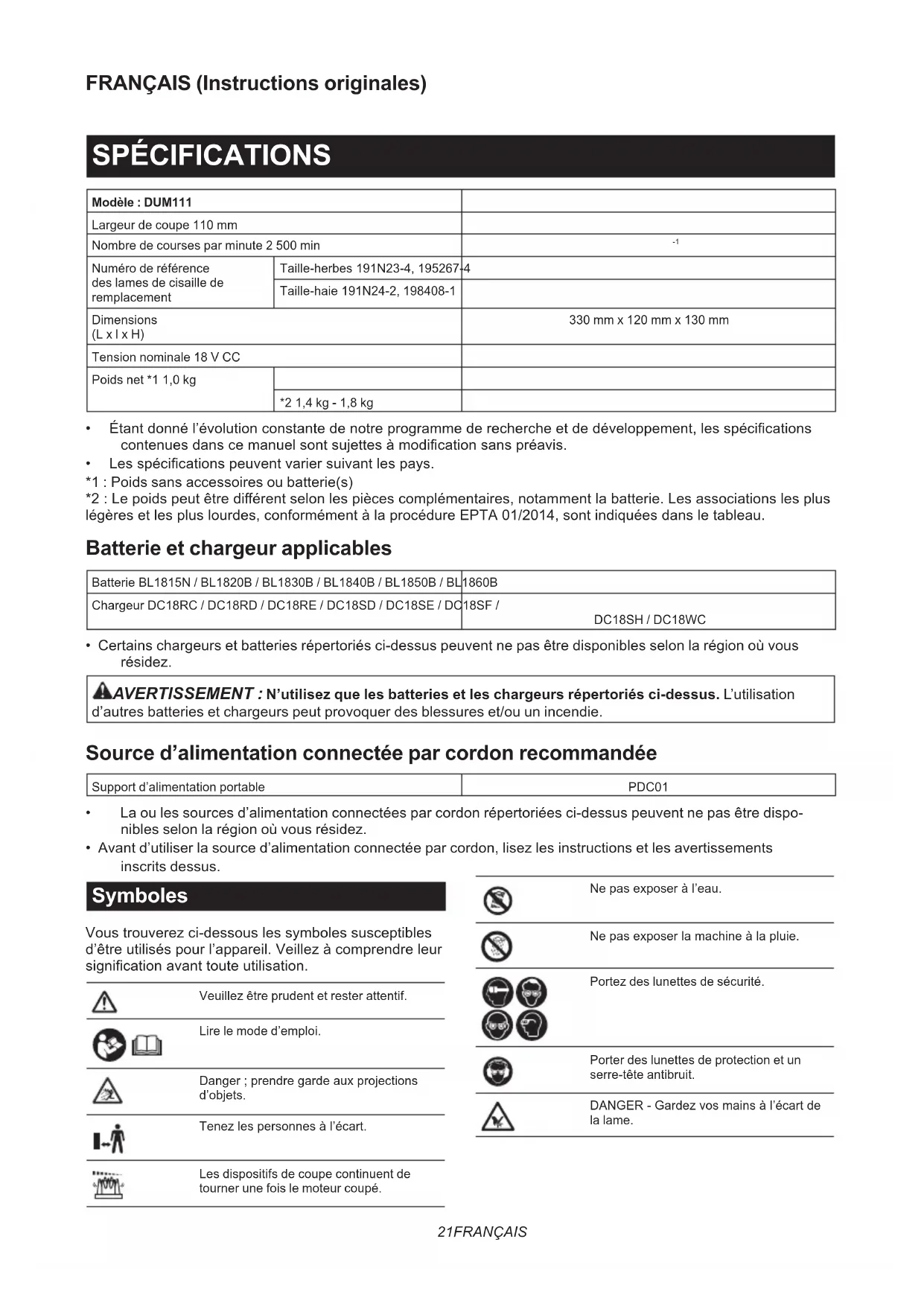 - Lesspécicationspeuventvariersuivantlespays. *1 : Poids sans accessoires ou batterie(s) *2:Lepoidspeutêtrediérentselonlespiècescomplémentaires,notammentlabatterie.Lesassociationslesplus légèresetlespluslourdes,conformémentàlaprocédureEPTA01/2014,sontindiquéesdansletableau. Batterie et chargeur applicables Batterie BL1815N / BL1820B / BL1830B / BL1840B / BL1850B / BL1860B Chargeur DC18RC / DC18RD / DC18RE / DC18SD / DC18SE / DC18SF / DC18SH / DC18WC