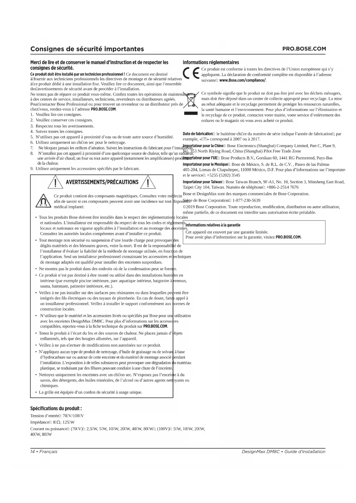 Spécifications du produit: Tension d’entrée: 70V/100V Impédance: 8Ω, 125W Courant ou puissance: (70V): 2,5W, 5W, 10W, 20W, 40W, 80W; (100V): 5W, 10W, 20W, 40W, 80W Informations réglementaires Ce produit est conforme à toutes les directives de l’Union européenne qui s’y appliquent. La déclaration de conformité complète est disponible à l’adresse suivante: www.Bose.com/compliance/. Ce symbole signifie que le produit ne doit pas être jeté avec les déchets ménagers, mais doit être déposé dans un centre de collecte approprié pour recyclage. La mise au rebut adéquate et le recyclage permettent de protéger les ressources naturelles, la santé humaine et l’environnement. Pour plus d’informations sur l’élimination et le recyclage de ce produit, contactez votre mairie, votre service d’enlèvement des ordures ou le magasin où vous avez acheté ce produit. Date de fabrication: le huitième chire du numéro de série indique l’année de fabrication; par exemple, «7» correspond à 2007 ou à 2017. Importateur pour la Chine: Bose Electronics (Shanghai) Company Limited, Part C, Plant 9, No. 353 North Riying Road, China (Shanghai) Pilot Free Trade Zone Importateur pour l’UE: Bose Products B.V., Gorslaan 60, 1441 RG Purmerend, Pays-Bas Importateur pour le Mexique: Bose de México, S. de R.L. de C.V. , Paseo de las Palmas 405-204, Lomas de Chapultepec, 11000 México, D.F. Pour plus d’informations sur l’importateur et le service: +5255 (5202) 3545 Importateur pour Taïwan: Bose Taiwan Branch, 9F-A1, No. 10, Section 3, Minsheng East Road, Taipei City 104, Taïwan. Numéro de téléphone: +886-2-2514 7676 Bose et DesignMax sont des marques commerciales de Bose Corporation. Siège de Bose Corporation: 1-877-230-5639 ©2019 Bose Corporation. Toute reproduction, modification, distribution ou autre utilisation, même partielle, de ce document est interdite sans autorisation écrite préalable. Informations relatives à la garantie Cet appareil est couvert par une garantie limitée. Pour avoir plus d’information sur la garantie, visitez PRO.BOSE.COM.