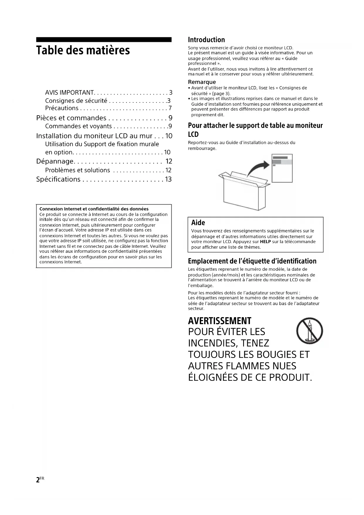 - Spécifications Introduction Sony vous remercie d’avoir choisi ce moniteur LCD.Le présent manuel est un guide à visée informative. Pour un usa ge professionnel, veuillez vous référer au « Guide professionnel ».Avant de l’utiliser, nous vous invitons à lire attentivement ce nuel et à le conserver pour vous y référer ultérieurement.Remarque p. 13