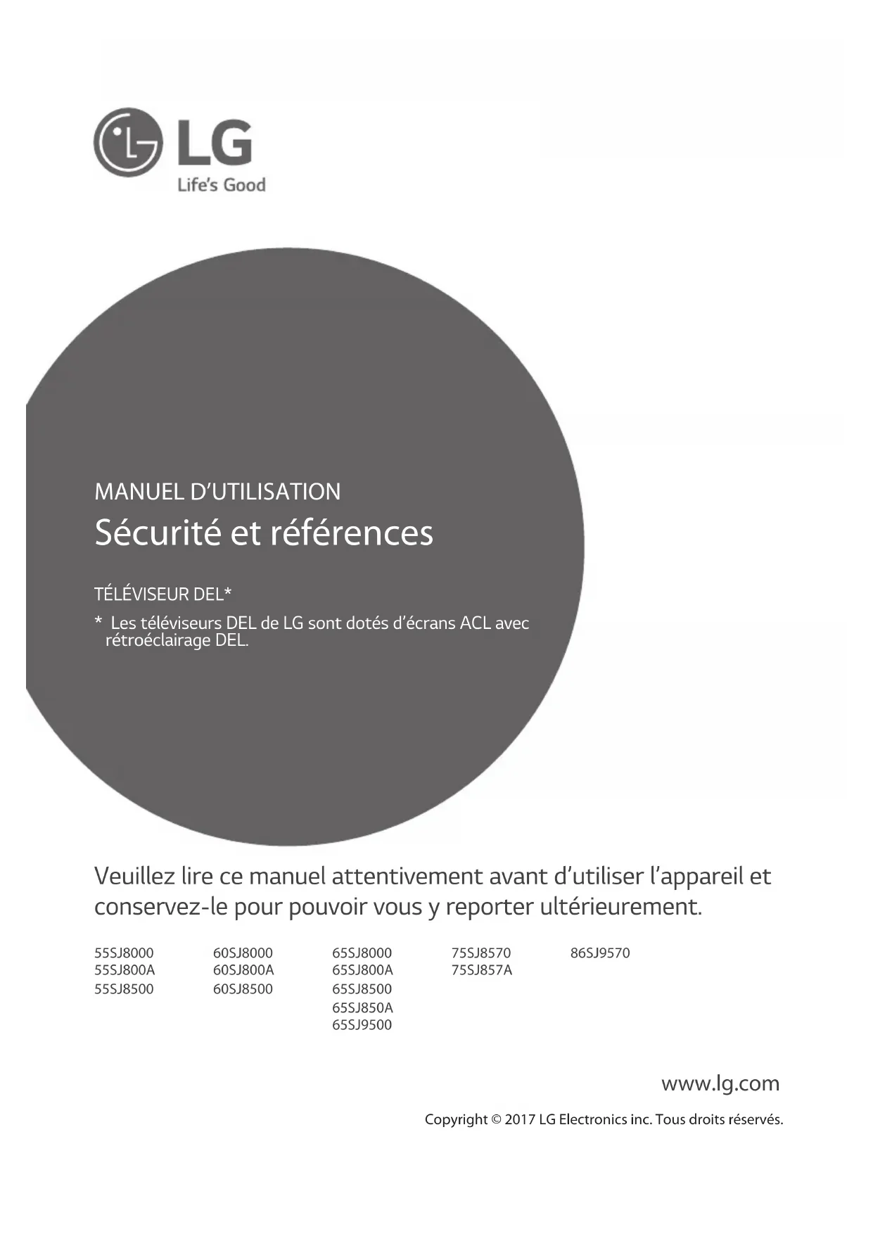 - Les téléviseurs DEL de LG sont dotés d’écrans ACL avec rétroéclairage DEL. www.lg.com Veuillez lire ce manuel attentivement avant d’utiliser l’appareil et conservez-le pour pouvoir vous y reporter ultérieurement. 55SJ800055SJ800A55SJ850060SJ800060SJ800A60SJ850065SJ800065SJ800A65SJ850065SJ850A65SJ950075SJ857075SJ857A86SJ9570Copyright © 2017 LG Electronics inc. Tous droits réservés.2 FRANÇAIS AVERTISSEMENT! Directives de sécurité importantes Lisez ces directives. Conservez ces directives. Soyez attentif à tous les avertissements. Suivez toutes les directives.