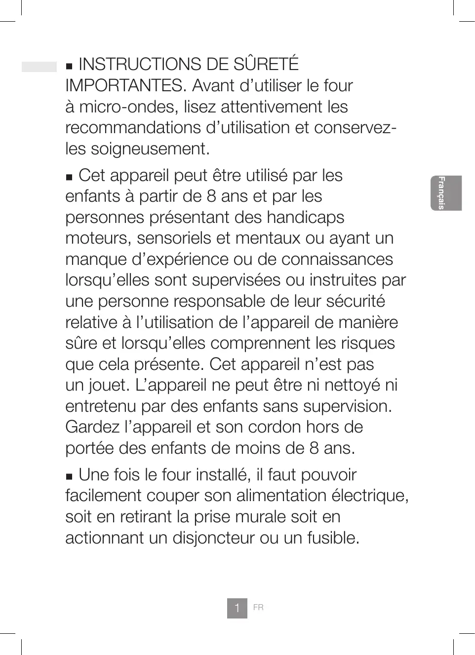 Ce four ne devrait pas être utilisé par des personnes (y compris des enfants) dont les capacités sensorielles ou mentales sont réduites, ou bien qui n’ont pas l’expérience ni les connaissances requises, à moins d’être surveillées par une personne chargée de leur sécurité ou d’avoir reçu de cette personne les instructions nécessaires pour l’utilisation de l’appareil. Français