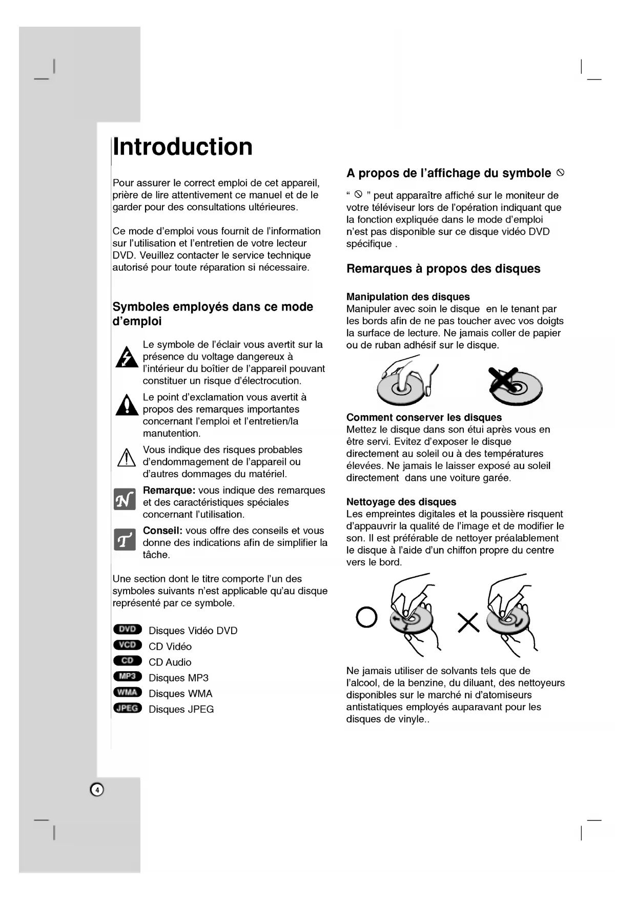 propos des disques Manipulation des disques Manipuler avecsoinle disque enletenantparlesbordsafindenepastoucheravecvos doigts lasurfacedelecture.Ne jamais collerde papier ouderubanadhesifsurle disque. Comment conserverles disques Mettezle disque danssonetui apres vousenetreservi.Evitez d'exposer disque directementausoleilouades temperatures elevees.Ne jamais lelaisser expose ausoleildirectementdansunevoiture garee. Nettoyage des disques Les empreintes digitales etla poussiere risquent d'appauvrir qualite l'image etdemodifierleson.Ilest preferable nettoyer prealablement disque al'aided'unchiffonpropreducentreverslebord.Ne jamais utiliserdesolvantstelsquede l'alcool, dela benzine, diluant, des nettoyeurs disponibles surlemarchenid'atomiseurs antistatiques employes auparavant pourles disques vinyle.. JPEGWMAMP3CDVCDDVD Introduction5 Types disques dontlalecture peut etre effectuee DVD (disquede8cm/12cm) CDVideo (VCD) (disque de8cm/12cm) CDAudio (disque de8cm/12cm) Enoutre,cet appareil peuteffectuerlalectureDVD-R/DVD ±RW, CDde photos Kodak, SVCD, etCD-R/CD-RWcontenantdestitres audio, MP3, WMA, et/oudesfichiersJPEG. Remarques