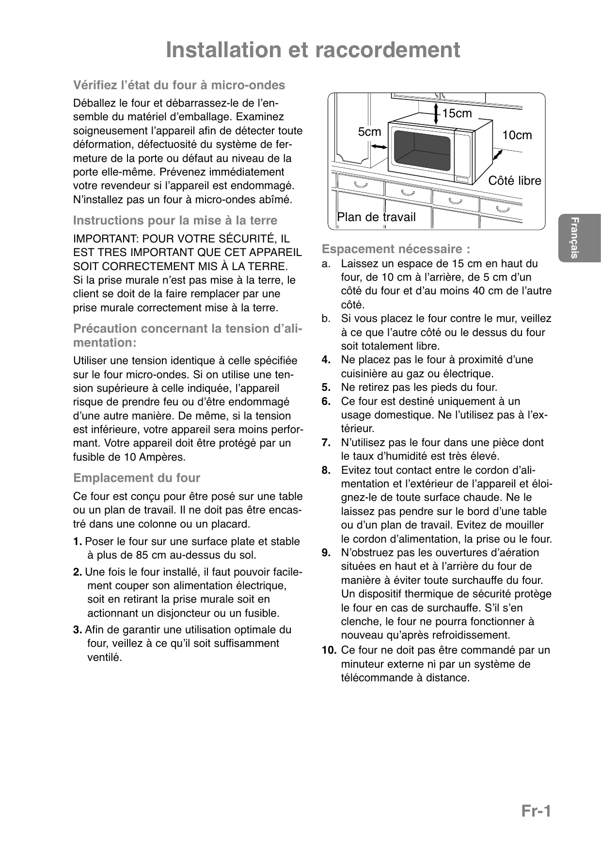 four, veillez à ce quʼil soit suffisamment ventilé. 5cm 10cm Côté libre Plan de travail Français Instructions pour la mise à la terre 15cm Espacement nécessaire : a. Laissez un espace de 15 cm en haut du four, de 10 cm à lʼarrière, de 5 cm dʼun côté du four et dʼau moins 40 cm de lʼautre côté. b. Si vous placez le four contre le mur, veillez à ce que lʼautre côté ou le dessus du four soit totalement libre.