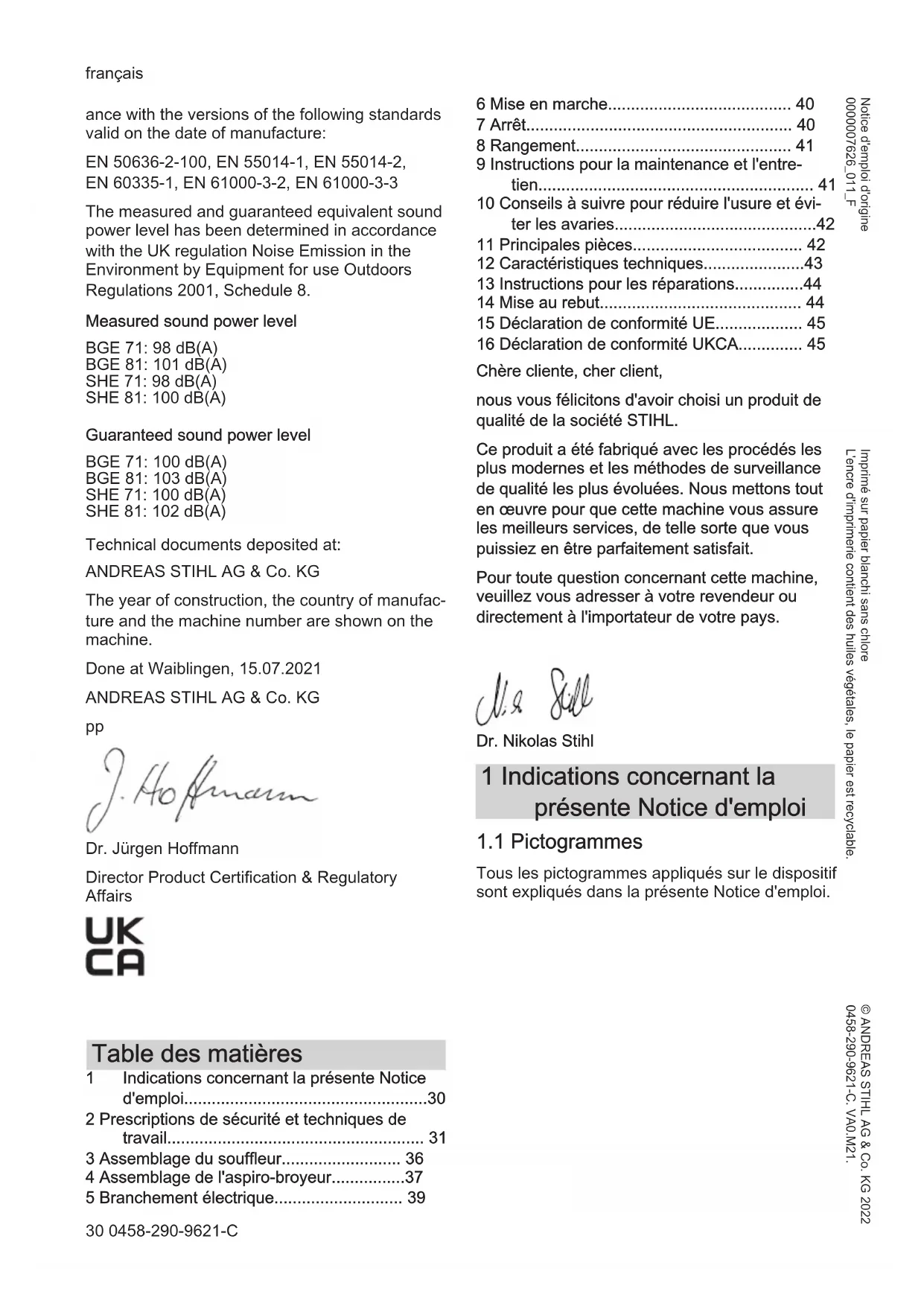 est conforme à toutes les prescriptions applica‐ bles des règlements UK The Restriction of the Use of Certain Hazardous Substances in Electri‐ cal and Electronic Equipment Regulations 2012, Supply of Machinery (Safety) Regulations 2008, Noise Emission in the Environment by Equip‐ ment for use Outdoors Regulations 2001 et Elec‐ tromagnetic Compatibility Regulations 2016, et a été développé et fabriqué conformément à la version des normes suivantes respectivement valable à la date de fabrication : EN 50636‑2‑100, EN 55014‑1, EN 55014‑2, EN 60335‑1, EN 61000‑3‑2, EN 61000‑3‑3. Le calcul du niveau de puissance acoustique mesuré et du niveau de puissance acoustique garanti a été effectué suivant une procédure 15 Déclaration de conformité UE français 0458-290-9621-C 45conforme à la directive UK Noise Emission in the Environment by Equipment for use Outdoors Regulations 2001, Schedule 8. Niveau de puissance acoustique mesuré BGE 71 : 98 dB(A) BGE 81 : 101 dB(A) SHE 71 : 98 dB(A) SHE 81 : 100 dB(A) Niveau de puissance acoustique garanti BGE 71 : 100 dB(A) BGE 81 : 103 dB(A) SHE 71 : 100 dB(A) SHE 81 : 102 dB(A) Conservation des documents techniques : ANDREAS STIHL AG & Co. KG L'année de fabrication, le pays de fabrication et le numéro de machine sont indiqués sur la machine. Waiblingen, le 15/07/2021 ANDREAS STIHL AG & Co. KG P. O. Dr. Jürgen Hoffmann Chef du Service Réglementation et Homologa‐ tion Produits Indice