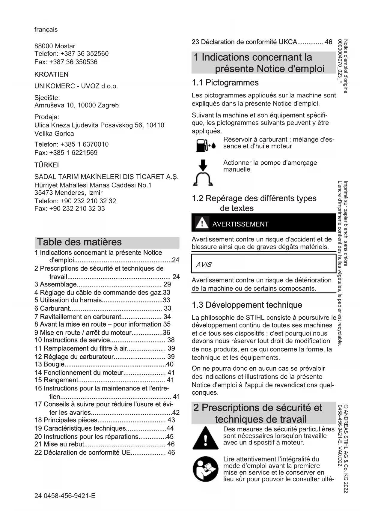 - 23 Déclaration de conformité UKCA 1 Indications concernant la présente Notice d'emploi p. 46