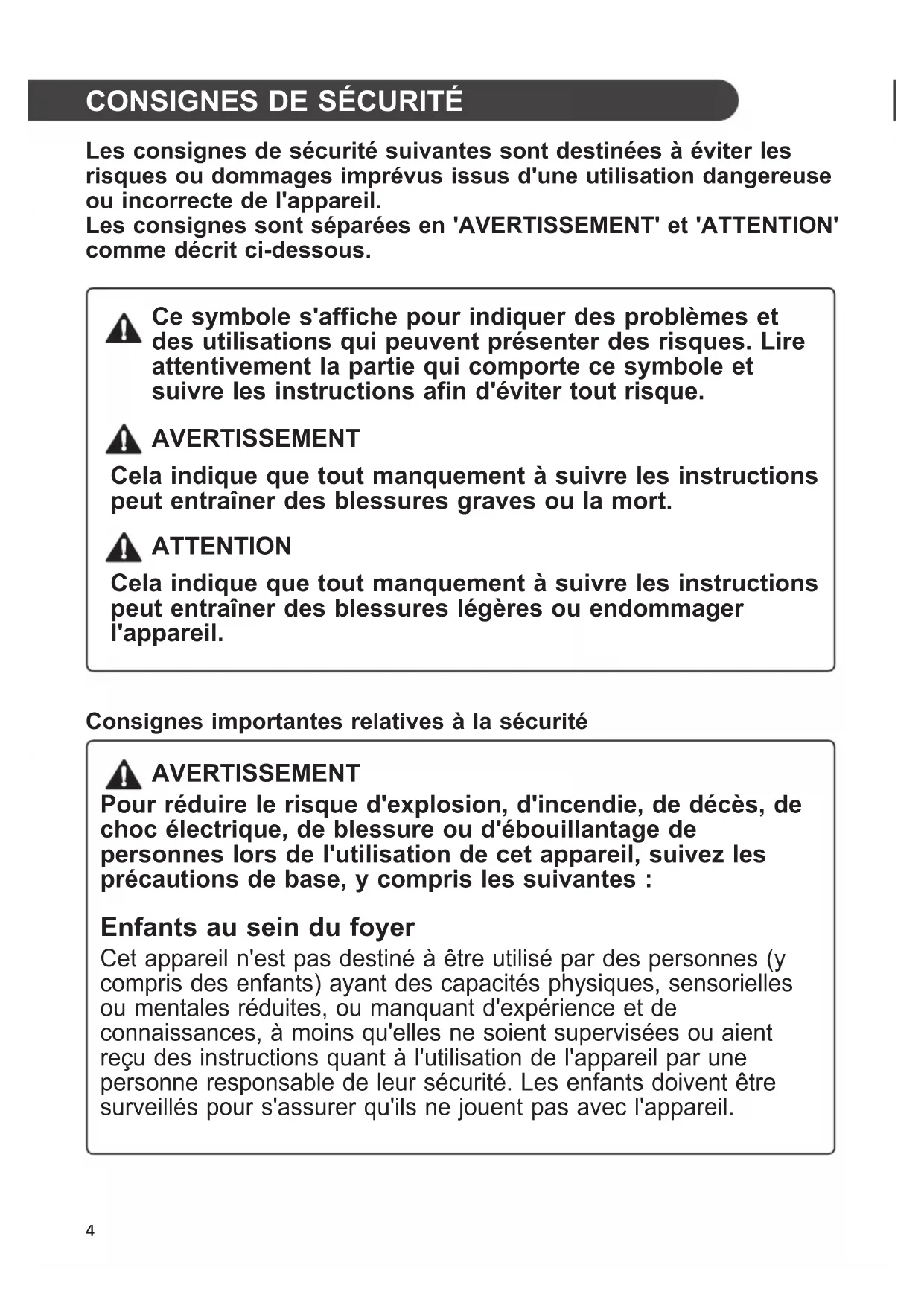 Les consignes sont séparées en 'AVERTISSEMENT' et 'ATTENTION' comme décrit ci-dessous.