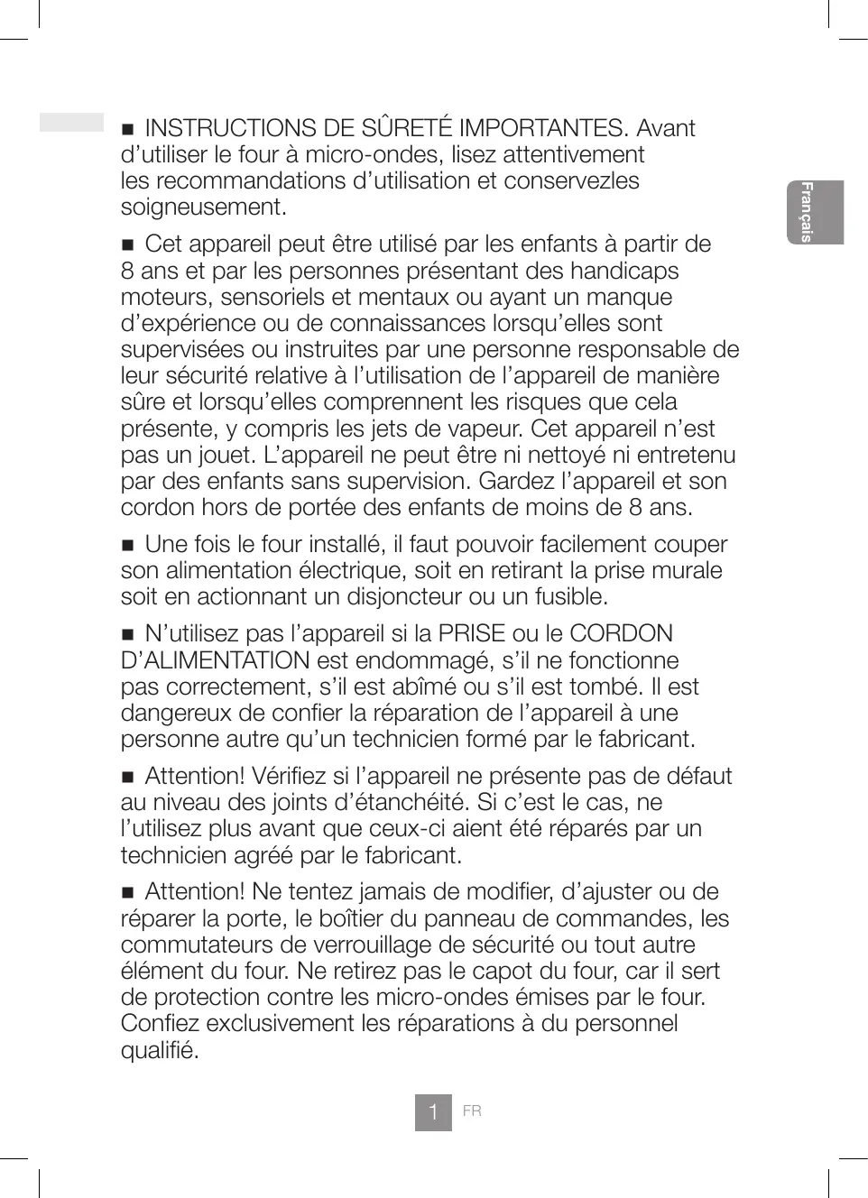 Français DE SÛRETÉ IMPORTANTES. Avant d’utiliser le four à micro-ondes, lisez attentivement les recommandations d’utilisation et conservezles soigneusement. Attention! Les aliments et les liquides ne doivent pas être chauffés dans des récipients fermés hermétiquement car ceux-ci risquent d’exploser. Attention! Ne placez pas le four à proximité d’une cuisinière au gaz ou électrique. Attention! Il ne faut laisser les enfants utiliser le four qu’à la seule condition qu’ils en connaissent le fonctionnement et soient à même de comprendre les dangers d’une utilisation inappropriée. Ce four ne peut être utilisé que posé sur un plan de travail. Il n’est pas conçu pour une utilisation dans un meuble ou une colonne. Utilisation sur un plan de travail: Le four doit être placé sur une surface plane et stable à 85 cm au dessus du sol, avec le fond positionné contre une cloison. Pour garantir un fonctionnement optimal, le four doit être suffisamment ventilé, avec par exemple un espacement de 5 cm d’un côté, l’autre côté étant libre; 15 cm sur le dessus; 10 cm à l’arrière. Si vous réchauffez des aliments dans des barquettes en plastique ou en papier, surveillez régulièrement la cuisson, car ces matériaux ont tendance à s’enflammer en cas de surchauffe. Si vous constatez l’émission de fumée ou la présence de flammes dans le four, appuyer sur la touche Arrêt/ Annulation et laisser la porte fermée de manière à étouffer les flammes. Débrancher le cordon d’alimentation ou couper le courant au niveau du fusible ou du disjoncteur. Cet appareil est destiné à un usage domestique uniquement. Si on chauffe un liquide épais qui n’a pas été remué, il risque de déborder et d’occasionner des projections brûlantes pendant et après le réchauffage