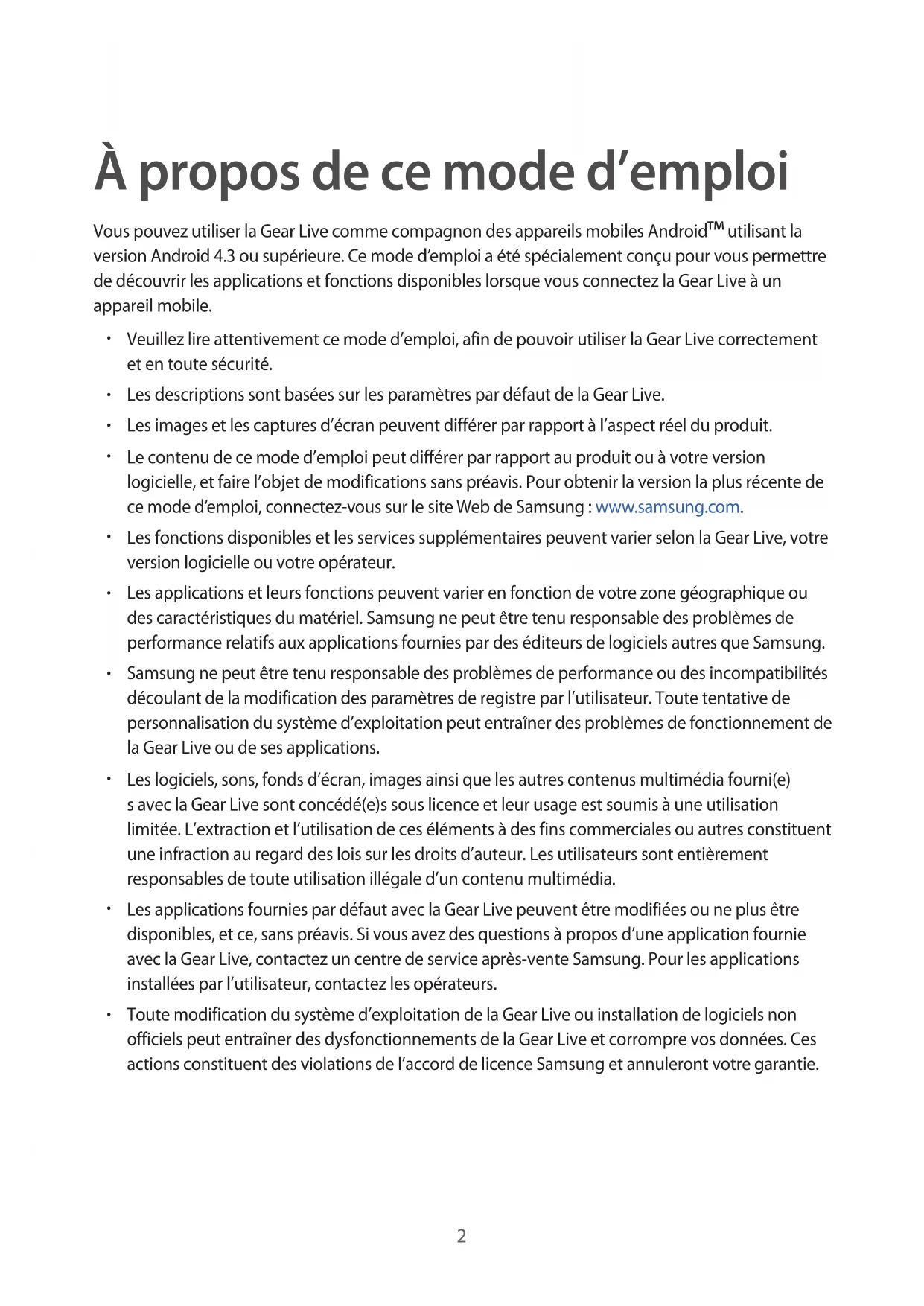 www.samsung.com Mode d’emploi SM-R3822 À propos de ce mode d’emploi Vous pouvez utiliser la GearLive comme compagnon des appareils mobiles Android