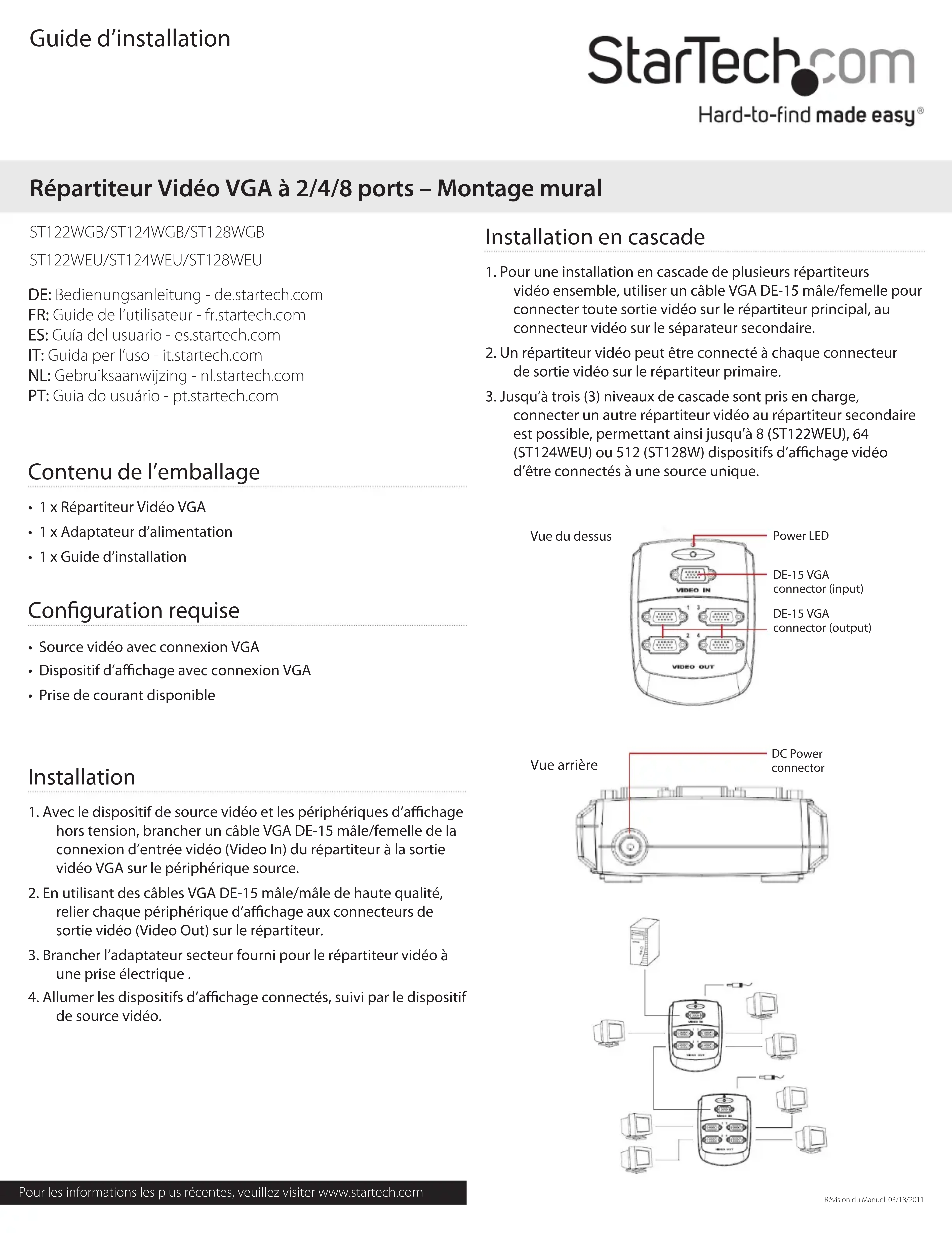 connecter un autre répartiteur vidéo au répartiteur secondaire est possible, permettant ainsi jusqu’à 8 (ST122WEU), 64 (ST124WEU) ou 512 (ST128W) dispositifs d’achage vidéo d’être connectés à une source unique. Révision du Manuel: 03/18/2011Pour les informations les plus récentes, veuillez visiter www.startech.comDéclaration de conformité FCC Cet équipement a été testé et trouvé conforme aux limites pour un dispositif numérique de classe B, conformément à la partie 15 des règles FCC. Ces limites visent à assurer une protection raisonnable contre les interférences nuisibles dans un milieu résidentiel. Cet équipement génère, utilise et peut émettre des fréquences radio et, s’il n’est pas installé et utilisé conformément aux instructions, peut entraîner des interférences nuisibles aux communications radio. Toutefois, il n’existe aucune garantie que des interférences ne se produiront pas dans une installation particulière. Si cet équipement provoque des interférences nuisibles à la réception radio ou de télévision, qui peut être déterminé en mettant en allumant et éteignant l’équipement, l’utilisateur est encouragé à essayer de corriger l’interférence par une ou plusieurs des mesures suivantes:
