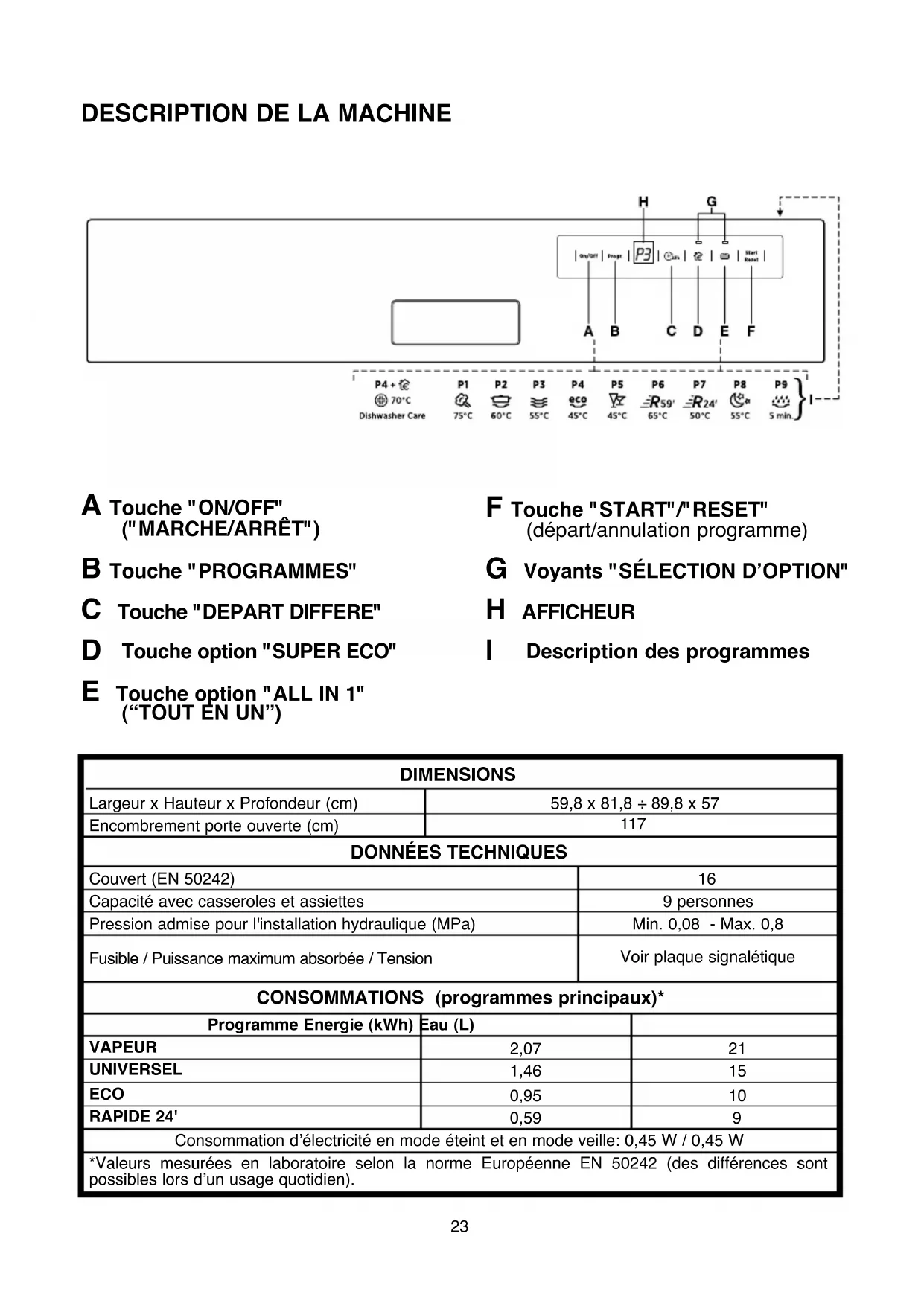 9 personnes Min. 0,08 - Max. 0,8 Voir plaque signalétique Consommation d’électricité en mode éteint et en mode veille: 0,45 W / 0,45 W *Valeurs mesurées en laboratoire selon la norme Européenne EN 50242 (des différences sont possibles lors d’un usage quotidien). 59,8 x 81,8 ÷ 89,8 x 57