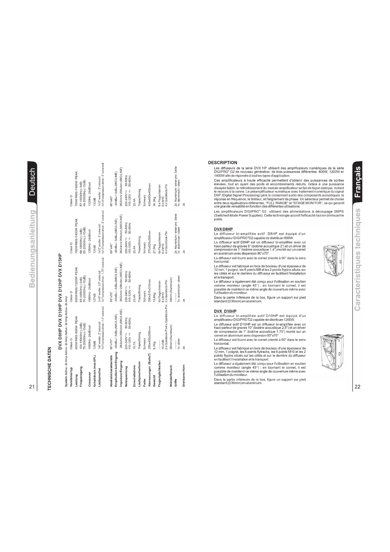 Caracteristiques techniquesCaracteristiques techniques Français DESCRIPTION Les diffuseurs de la série DVX HP utilisent des amplificateurs numériques de la série DIGIPRO G2 de nouveau génération; de trois puissances différentes 800W, 1200W et 1400W afin de répondre à tout les types d'application.Ces amplificateurs à haute efficacité permettent d'obtenir des puissances de sorties élevées, tout en ayant des poids et encombrements réduits. Grâce à une puissance dissipée faible, le refroidissement du module amplificateur se fait de façon statique, évitant le recours à la vanne. Le préamplificateur numérique avec traitement numérique du signal DSP (Digital Signal Processing) gère le croisement audio des composants acoustiques, la réponse en fréquence, le limiteur, et l'alignement de phase. Un sélecteur permet de choisir entre deux égalisations différentes, “FULL RANGE” et “STAGE MONITOR“, ce qui garantit une grande versatilité en fonction des différentes utilisations. Les amplificateurs DIGIPRO G2 utilisent des alimentations à découpage SMPS (Switched-Mode Power Supplies). Cette technologie accroît l'efficacité tout en diminuant le poids.