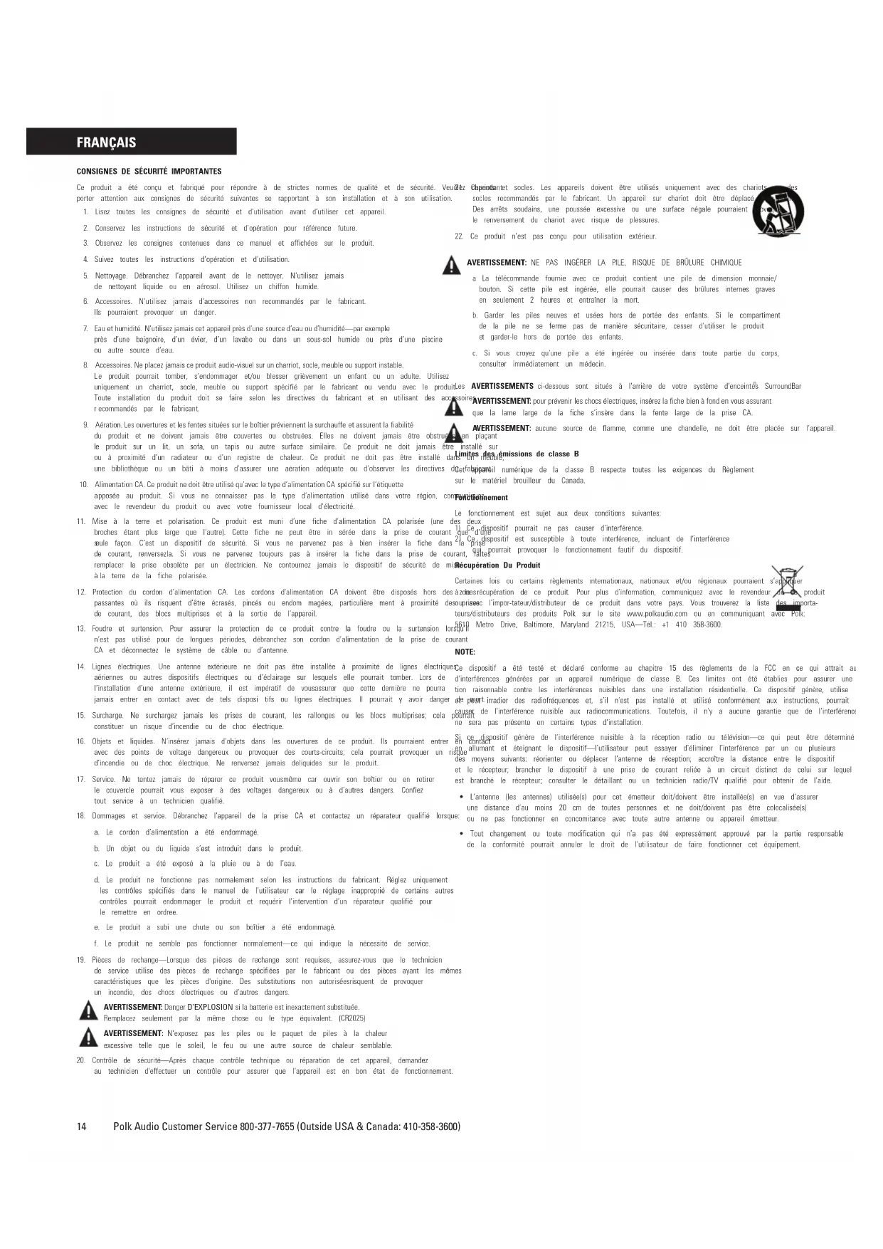 u avec l’impor-tateur/distributeur de ce produit dans votre pays. Vous trouverez la liste des importa- teurs/distributeurs des produits Polk sur le site www.polkaudio.com ou en communiquant avec Polk: 5610 Metro Drive, Baltimore, Maryland 21215, USA—Tél.: +1 410 358-3600. NOTE: Ce dispositif a été testé et déclaré conforme au chapitre 15 des règlements de la FCC en ce qui attrait aux limites d’interférences générées par un appareil numérique de classe B. Ces limites ont été établies pour assurer une protec- tion raisonnable contre les interférences nuisibles dans une installation résidentielle. Ce dispositif génère, utilise et peut irradier des radiofréquences et, s’il n’est pas installé et utilisé conformément aux instructions, pourrait causer de l’interférence nuisible aux radiocommunications. Toutefois, il n’y a aucune garantie que de l’interférence ne sera pas présente en certains types d’installation. Si ce dispositif génère de l’interférence nuisible à la réception radio ou télévision—ce qui peut être déterminé en allumant et éteignant le dispositif—l’utilisateur peut essayer d’éliminer l’interférence par un ou plusieurs des moyens suivants: réorienter ou déplacer l’antenne de réception; accroître la distance entre le dispositif et le récepteur; brancher le dispositif à une prise de courant reliée à un circuit distinct de celui sur lequel est branché le récepteur; consulter le détaillant ou un technicien radio/TV qualifié pour obtenir de l’aide.