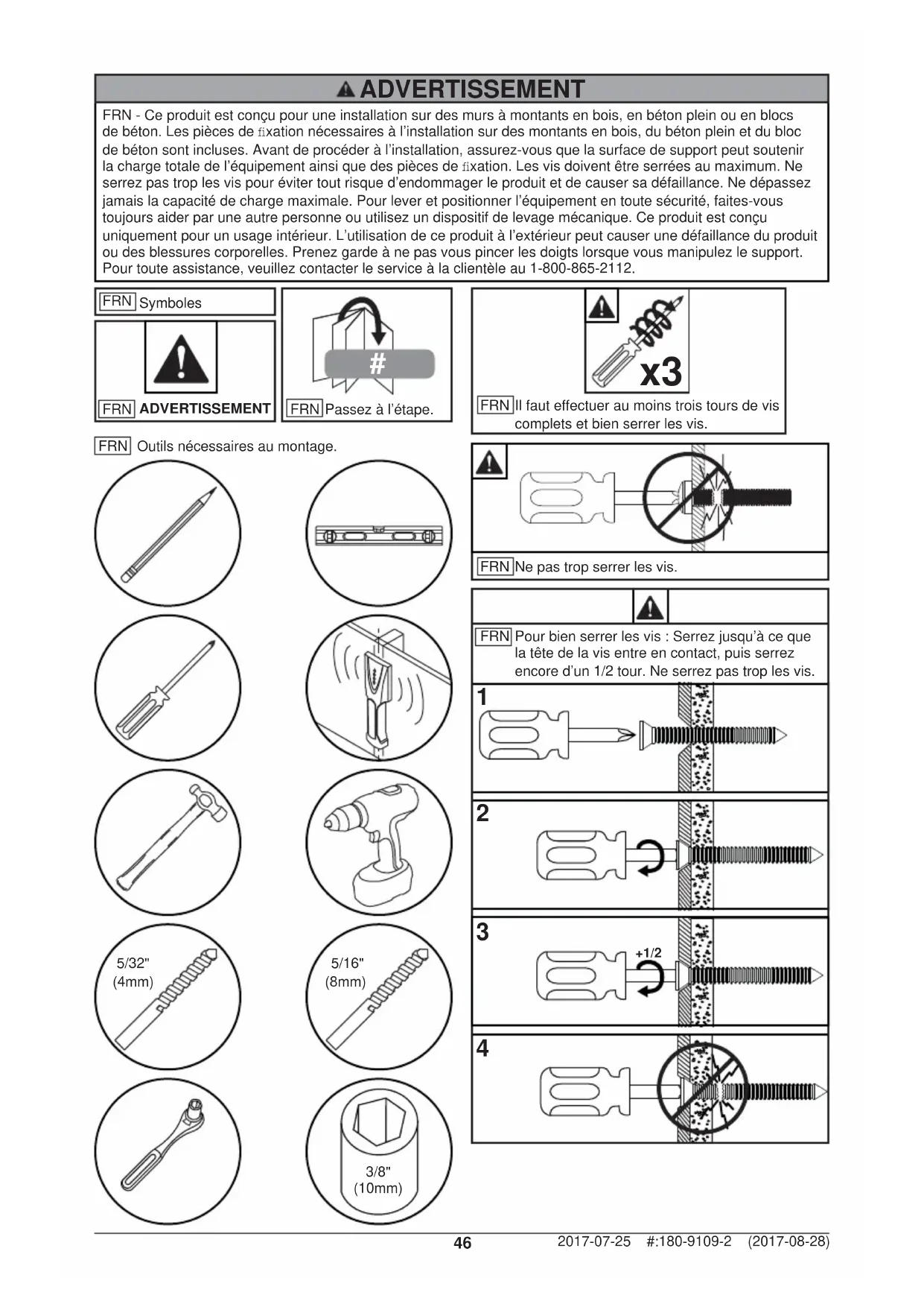 Il faut effectuer au moins trois tours de vis complets et bien serrer les vis. FRN Ne pas trop serrer les vis. FRN Outils nécessaires au montage. FRN