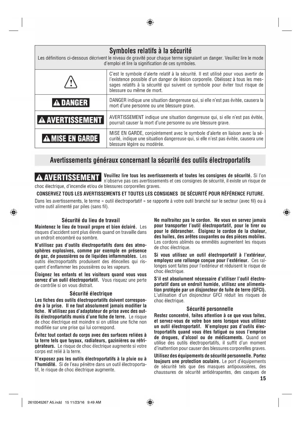 PARTS INSIDE. Preventive maintenance performed by un au thorized per- sonnel may result in misplacing of internal wires and components which could cause se- rious hazard. We recom mend that all tool ser- vice be performed by a Bosch Factory Service Center or Authorized Bosch Service Station. SERVICE MEN: Disconnect tool and/or charger from power source before servicing. Batteries Be alert for battery packs that are nearing their end of life. If you notice decreased tool performance or significantly shorter running time between charges then it is time to replace the battery pack. Failure to do so can cause the tool to operate improperly or damage the charger. Tool Lubrication Your Bosch tool has been properly lubricated and is ready for use. Motors The motor in your tool has been engineered for many hours of dependable service. To maintain peak efficiency of the motor, we recommend it be examined every six months. Only a genuine Bosch replacement motor specially designed for your tool should be used. Cleaning To avoid accidents, always disconnect the tool and/or charger from the power supply before clean- ing. The tool may be cleaned most effectively with com pressed dry air. Always wear safety goggles when cleaning tools with com- pressed air. Ventilation openings and switch levers must be kept clean and free of foreign matter. Do not attempt to clean by inserting pointed objects through opening. Certain cleaning agents and solvents damage plastic parts. Some of these are: gasoline, car bon tetra- chloride, chlorinated cleaning solvents, ammonia and household detergents that contain ammonia. 2610045267 A5.indd 14 11/23/16 9:49 AM15 Veuillez lire tous les avertissements et toutes les consignes de sécurité. Si l’on n’observe pas ces avertissements et ces consignes de sécurité, il existe un risque de choc électrique, d’incendie et/ou de blessures corporelles graves. CONSERVEZ TOUS LES AVERTISSEMENTS ET TOUTES LES CONSIGNES DE SÉCURITÉ POUR RÉFÉRENCE FUTURE. Dans les avertissements, le terme « outil électroportatif » se rapporte à votre outil branché sur le secteur (avec fil) ou à votre outil alimenté par piles (sans fil). Sécurité du lieu de travail Maintenez le lieu de travail propre et bien éclairé. Les risques d’accident sont plus élevés quand on travaille dans un endroit encombré ou sombre. N’utilisez pas d’outils électroportatifs dans des atmo- sphères explosives, comme par exemple en présence de gaz, de poussières ou de liquides inammables. Les outils électroportatifs produisent des étincelles qui ris- quent d’enflammer les poussières ou les vapeurs. Éloignez les enfants et les visiteurs quand vous vous servez d’un outil électroportatif. Vous risquez une perte de contrôle si on vous distrait. Sécurité électrique Les ches des outils électroportatifs doivent correspon- dre à la prise. Il ne faut absolument jamais modier la che. N’utilisez pas d’adaptateur de prise avec des out- ils électroportatifs munis d’une che de terre. Le risque de choc électrique est moindre si on utilise une fiche non modifiée sur une prise qui lui correspond. Évitez tout contact du corps avec des surfaces reliées à la terre tels que tuyaux, radiateurs, gazinières ou réfri- gérateurs. Le risque de choc électrique augmente si votre corps est relié à la terre. N’exposez pas les outils électroportatifs à la pluie ou à l’humidité. Si de l’eau pénètre dans un outil électroporta- tif, le risque de choc électrique augmente. Ne maltraitez pas le cordon. Ne vous en servez jamais pour transporter l’outil électroportatif, pour le tirer ou pour le débrancher. Éloignez le cordon de la chaleur, des huiles, des arêtes coupantes ou des pièces mobiles. Les cordons abîmés ou emmêlés augmentent les risques de choc électrique. Si vous utilisez un outil électroportatif à l’extérieur, employez une rallonge conçue pour l’extérieur. Ces ral- longes sont faites pour l’extérieur et réduisent le risque de choc électrique. S’il est absolument nécessaire d’utiliser l’outil électro- portatif dans un endroit humide, utilisez une alimenta- tion protégée par un disjoncteur de fuite de terre (GFCI). L’utilisation d’un disjoncteur GFCI réduit les risques de choc électrique. Sécurité personnelle Restez concentré, faites attention à ce que vous faites, et servez-vous de votre bon sens lorsque vous utilisez un outil électroportatif. N’employez pas d’outils élec- troportatifs quand vous êtes fatigué ou sous l’emprise de drogues, d’alcool ou de médicaments. Quand on utilise des outils électroportatifs, il suffit d’un moment d’inattention pour causer des blessures corporelles graves. Utilisez des équipements de sécurité personnelle. Portez toujours une protection oculaire. Le port d’équipements de sécurité tels que des masques antipoussières, des chaussures de sécurité antidérapantes, des casques de Avertissements généraux concernant la sécurité des outils électroportatifs Symboles relatifs à la sécurité Les définitions ci-dessous décrivent le niveau de gravité pour chaque terme signalant un danger. Veuillez lire le mode d’emploi et lire la signification de ces symboles.