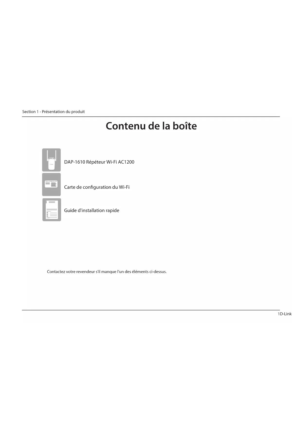 Contenu de la boîte Note sur la conguration du Wi-Fi Contactez votre revendeur s’il manque l’un des éléments ci-dessus. DAP-1610 Répéteur Wi-Fi AC1200 Carte de conguration du Wi-Fi Guide d'installation rapide2D-Link DAP-1610 Manuel d’utilisation