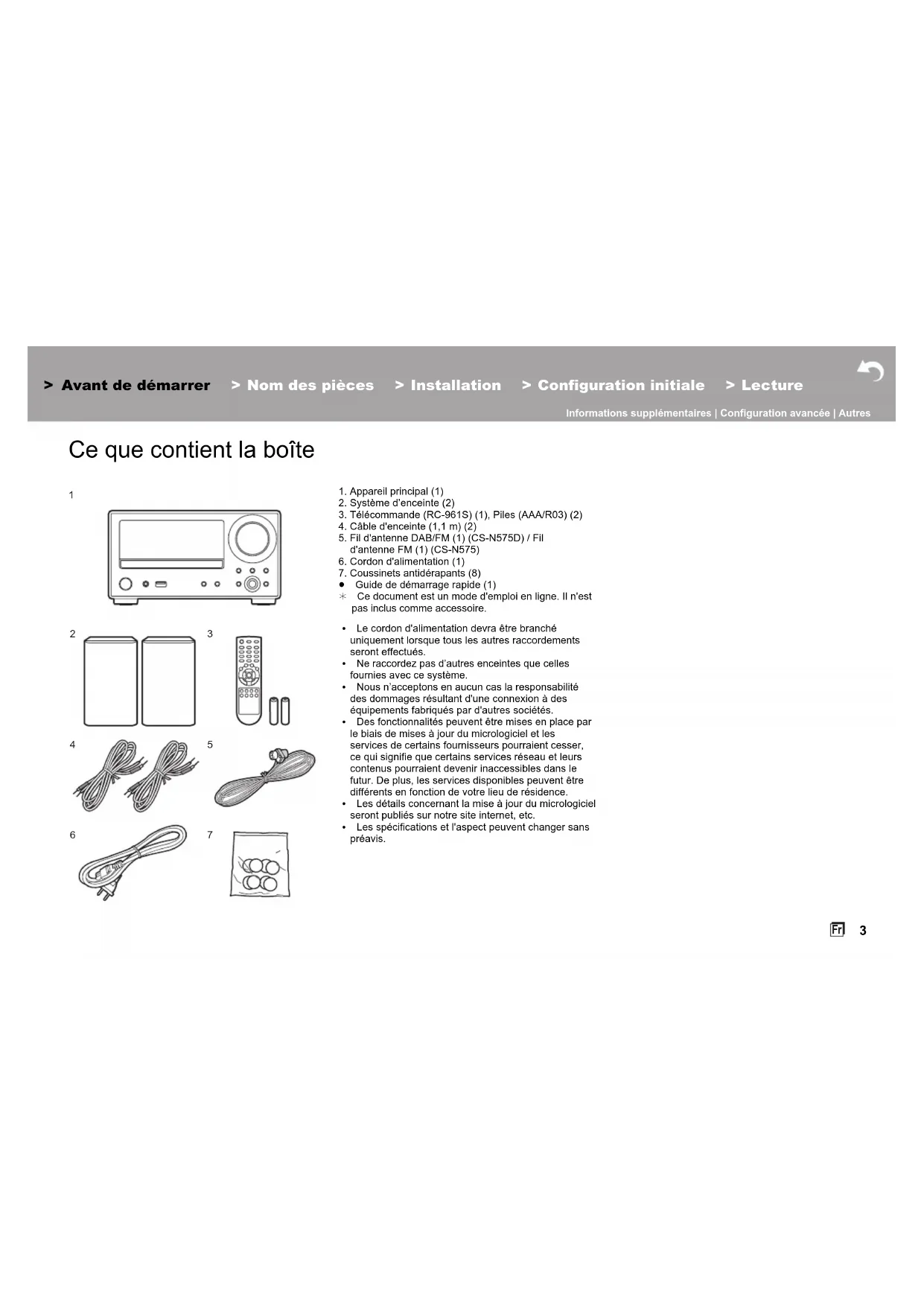 Ce que contient la boîte 1. Appareil principal (1)2. Système d’enceinte (2)3. Télécommande (RC-961S) (1), Piles (AAA/R03) (2)4. Câble d'enceinte (1,1 m) (2)5. Fil d'antenne DAB/FM (1) (CS-N575D) / Fil d'antenne FM (1) (CS-N575)6. Cordon d'alimentation (1)7. Coussinets antidérapants (8)≥ Guide de démarrage rapide (1)¢ Ce document est un mode d'emploi en ligne. Il n'est pas inclus comme accessoire.0 Le cordon d'alimentation devra être branché uniquement lorsque tous les autres raccordements seront effectués.0 Ne raccordez pas d’autres enceintes que celles fournies avec ce système.0 Nous n’acceptons en aucun cas la responsabilité des dommages résultant d'une connexion à des équipements fabriqués par d'autres sociétés.0 Des fonctionnalités peuvent être mises en place par le biais de mises à jour du micrologiciel et les services de certains fournisseurs pourraient cesser, ce qui signifie que certains services réseau et leurs contenus pourraient devenir inaccessibles dans le futur. De plus, les services disponibles peuvent être différents en fonction de votre lieu de résidence.0 Les détails concernant la mise à jour du micrologiciel seront publiés sur notre site internet, etc.0 Les spécifications et l'aspect peuvent changer sans préavis.