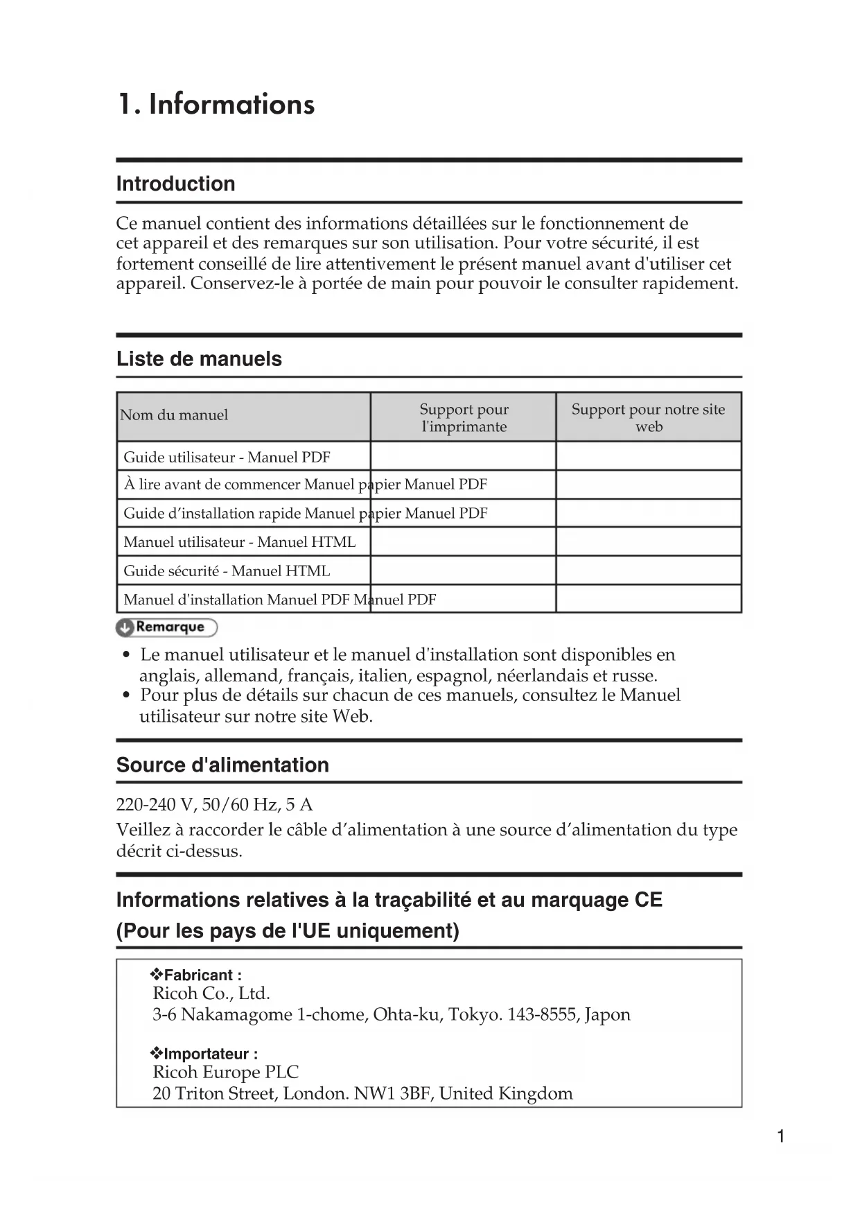 - Pour plus de détails sur chacun de ces manuels, consultez le Manuel utilisateur sur notre site Web. Source d'alimentation 220-240 V, 50/60 Hz, 5 A Veillez à raccorder le câble d’alimentation à une source d’alimentation du type décrit ci-dessus. Informations relatives à la traçabilité et au marquage CE (Pour les pays de l'UE uniquement) ❖ Fabricant : Ricoh Co., Ltd. 3-6 Nakamagome 1-chome, Ohta-ku, Tokyo. 143-8555, Japon ❖ Importateur : Ricoh Europe PLC 20 Triton Street, London. NW1 3BF, United Kingdom2 Avis de non-responsabilité Dans le cadre prévu par la loi, en aucun cas le fabricant ne peut être tenu responsable de tout dommage pouvant découler de pannes de cet appareil, de pertes de données enregistrées, ou de l'utilisation ou de la non utilisation de ce produit et des manuels utilisateurs fournis avec celui-ci. Assurez-vous d'avoir une copie ou une sauvegarde des données enregistrées sur l'appareil. Il est possible que des documents ou des données soient effacés en raison d'erreurs d'utilisation ou de dysfonctionnements de l'appareil. En aucun cas le fabricant ne pourrait être tenu responsable des documents que vous aurez créés à l'aide de cette appareil ou des résultats des données exécutées par vos soins. Remarques Pour des documents de bonne qualité, le fournisseur recommande l'utilisation de son toner. Le fabricant ne peut être tenu pour responsable des dommages ou frais résultant de l'utilisation de pièces autres que les pièces du fabricant pour vos appareils bureautiques.3