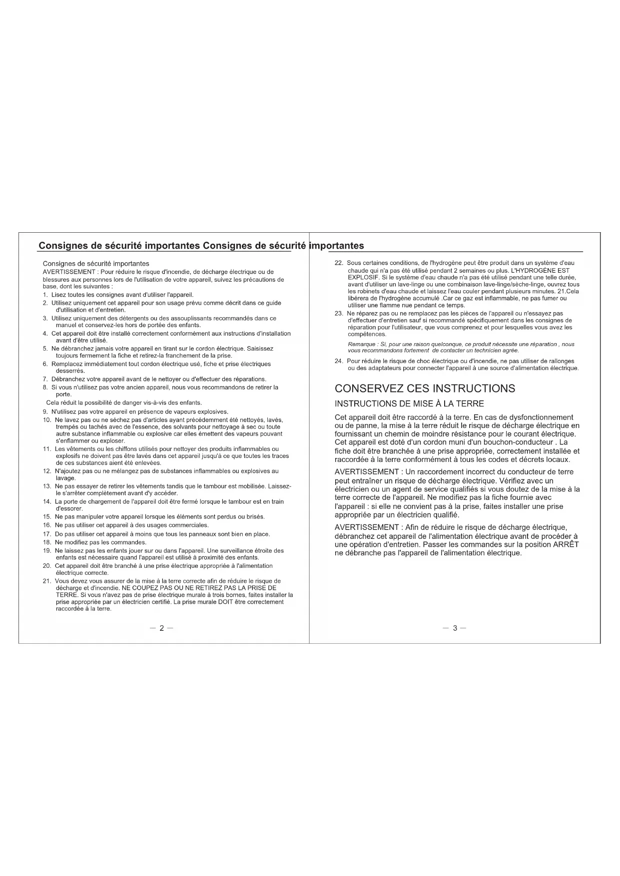 Consignes de sécurité importantes Consignes de sécurité importantes Consignes de sécurité importantes AVERTISSEMENT : Pour réduire le risque d'incendie, de décharge électrique ou de blessures aux personnes lors de l'utilisation de votre appareil, suivez les précautions de base, dont les suivantes :1. Lisez toutes les consignes avant d'utiliser l'appareil.2. Utilisez uniquement cet appareil pour son usage prévu comme décrit dans ce guide d'utilisation et d'entretien.3. Utilisez uniquement des détergents ou des assouplissants recommandés dans ce manuel et conservez-les hors de portée des enfants.4. Cet appareil doit être installé correctement conformément aux instructions d'installation avant d'être utilisé.5. Ne débranchez jamais votre appareil en tirant sur le cordon électrique. Saisissez toujours fermement la fiche et retirez-la franchement de la prise.6. Remplacez immédiatement tout cordon électrique usé, fiche et prise électriques desserrés.7. Débranchez votre appareil avant de le nettoyer ou d'effectuer des réparations.8. Si vous n'utilisez pas votre ancien appareil, nous vous recommandons de retirer la porte. Cela réduit la possibilité de danger vis-à-vis des enfants.9. N'utilisez pas votre appareil en présence de vapeurs explosives.10. Ne lavez pas ou ne séchez pas d'articles ayant précédemment été nettoyés, lavés, trempés ou tachés avec de l'essence, des solvants pour nettoyage à sec ou toute autre substance inflammable ou explosive car elles émettent des vapeurs pouvant s'enflammer ou exploser.11. Les vêtements ou les chiffons utilisés pour nettoyer des produits inflammables ou explosifs ne doivent pas être lavés dans cet appareil jusqu'à ce que toutes les traces de ces substances aient été enlevées.12. N'ajoutez pas ou ne mélangez pas de substances inflammables ou explosives au lavage.13. Ne pas essayer de retirer les vêtements tandis que le tambour est mobilisée. Laissez-le s'arrêter complètement avant d'y accéder.14. La porte de chargement de l'appareil doit être fermé lorsque le tambour est en train d'essorer.15. Ne pas manipuler votre appareil lorsque les éléments sont perdus ou brisés.16. Ne pas utiliser cet appareil à des usages commerciales.17. Do pas utiliser cet appareil à moins que tous les panneaux sont bien en place.18. Ne modifiez pas les commandes.19. Ne laissez pas les enfants jouer sur ou dans l'appareil. Une surveillance étroite des enfants est nécessaire quand l'appareil est utilisé à proximité des enfants.20. Cet appareil doit être branché à une prise électrique appropriée à l'alimentation électrique correcte.21. Vous devez vous assurer de la mise à la terre correcte afin de réduire le risque de décharge et d'incendie. NE COUPEZ PAS OU NE RETIREZ PAS LA PRISE DE TERRE. Si vous n'avez pas de prise électrique murale à trois bornes, faites installer la prise appropriée par un électricien certifié. La prise murale DOIT être correctement raccordée à la terre.22. Sous certaines conditions, de l'hydrogène peut être produit dans un système d'eau chaude qui n'a pas été utilisé pendant 2 semaines ou plus. L'HYDROGÈNE EST EXPLOSIF. Si le système d'eau chaude n'a pas été utilisé pendant une telle durée, avant d'utiliser un lave-linge ou une combinaison lave-linge/sèche-linge, ouvrez tous les robinets d'eau chaude et laissez l'eau couler pendant plusieurs minutes. 21.Cela libérera de l'hydrogène accumulé .Car ce gaz est inflammable, ne pas fumer ou utiliser une flamme nue pendant ce temps.23. Ne réparez pas ou ne remplacez pas les pièces de l'appareil ou n'essayez pas d'effectuer d'entretien sauf si recommandé spécifiquement dans les consignes de réparation pour l'utilisateur, que vous comprenez et pour lesquelles vous avez les compétences.Remarque : Si, pour une raison quelconque, ce produit nécessite une réparation , nous vous recommandons fortement de contacter un technicien agrée.24. Pour réduire le risque de choc électrique ou d'incendie, ne pas utiliser de rallonges ou des adaptateurs pour connecter l'appareil à une source d'alimentation électrique.