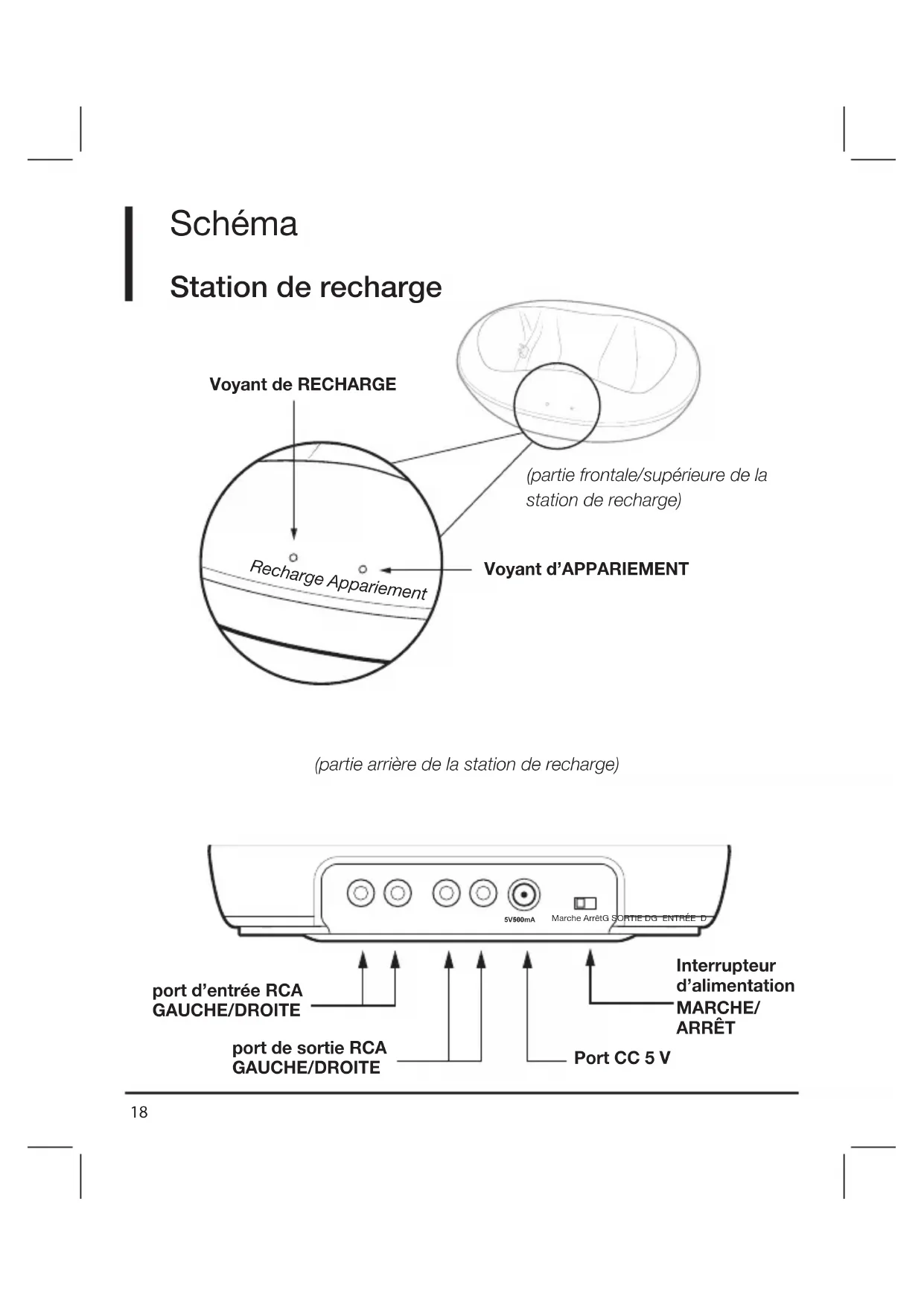 l’écouteur droit, appuyez sur le bouton de Volume haut ou bas pour augmenter ou diminuer le volume. Bouton Marche/Arrêt22 Guide relatif aux voyants, ports et boutons COMPOSANT DESCRIPTION Bouton Marche/Arrêt du casque d’écoute Appuyez longuement pour allumer le casque d’écoute. Appuyez longuement pour éteindre le casque d’écoute. VOLUME Appuyez pour augmenter le volume VOLUME Appuyez pour diminuer le volume Voyant d’Alimentation/ Appariement sur l’écouteur du casque d’écoute LUMIÈRE BLEUE: Les casques d’écoute et la station de recharge sont couplés. LUMIÈRE ROUGE: Les batteries du casque d’écoute sont épuisées. (Clignote pendant environ 30minutes avant que les batteries soient épuisées.) Voyant de recharge sur la station de recharge LUMIÈRE ROUGE: Les casques d’écoute sont en cours de rechargement. LUMIÈRE VERTE Les casques d’écoute sont chargés. Les voyants s’éteignent lorsque le casque d’écoute est retiré de la station de recharge. Voyant d’Appariement sur la station de recharge LUMIÈRE BLEUE CLIGNOTANTE: L’appariement des casques d’écoute et de la station de recharge est en cours. LUMIÈRE BLEUE CONTINUE: Les casques audio et la station de recharge sont associés par paire. Entrées RCA GAUCHE/DROITE Branchez l’appareil audio principal à partir de ce port. port de sortieRCA GAUCHE/ DROITE Branchez un appareil audio supplémentaire (facultatif) à partir de ce port. PortCC 5v Insérez l’extrémité de l’adaptateurCA dans ce port. Interrupteur d’alimentation