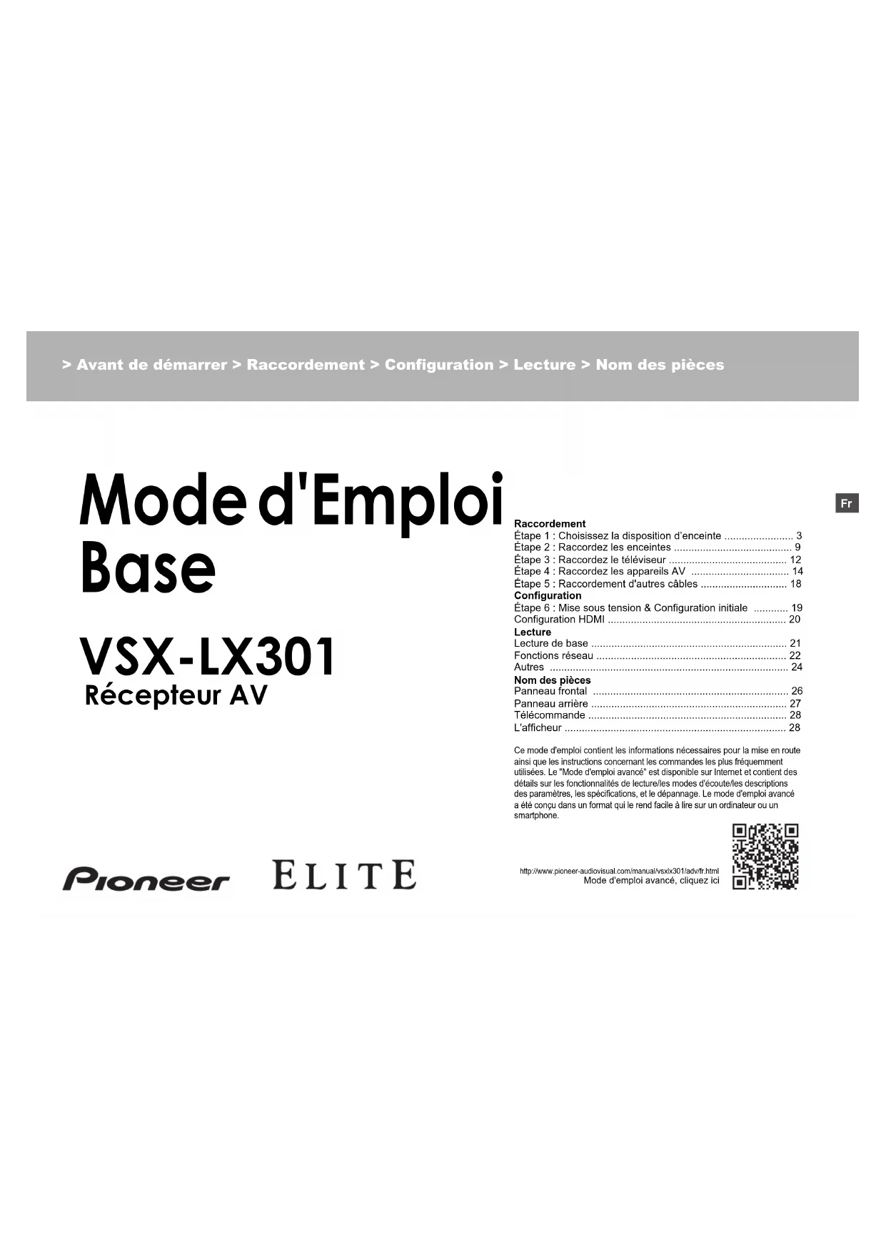 - L'afficheur Ce mode d'emploi contient les informations nécessaires pour la mise en route ainsi que les instructions concernant les commandes les plus fréquemment utilisées. Le "Mode d'emploi avancé" est disponible sur Internet et contient des détails sur les fonctionnalités de lecture/les modes d'écoute/les descriptions des paramètres, les spécifications, et le dépannage. Le mode d'emploi avancé a été conçu dans un format qui le rend facile à lire sur un ordinateur ou un smartphone. http://www.pioneer-audiovisual.com/manual/vsxlx301/adv/fr.htmlMode d'emploi avancé, cliquez ici VSX-LX301 > Avant de démarrer > Raccordement > Configuration > Lecture > Nom des pièces Récepteur AV SN29402194_VSX-301_BAS_Fr.book 1 ページ 2016年1月6日 水曜日 午前12時10分2 > Avant de démarrer > Raccordement > Configuration > Lecture > Nom des pièces Ce que contient la boîte p. 28