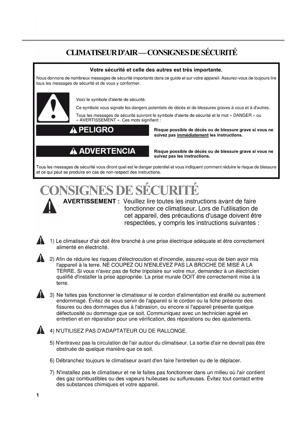 ATTENTION! Si le climatiseur d'air a été entreposé en position horizontale ou inclinée pour quelque période de temps que ce soit, attendez 24 heures avant de le rebrancher.3 Instructions importantes y Veuillez conserver ce guide dans un endroit sûr. y N'utilisez aucun liquide ou produit de nettoyage en aérosol pour nettoyer cet appareil. Servez-vous d'un linge humide. y Ne déversez jamais de liquide sur le panneau de commande. Cela pourrait entraîner une commotion électrique aux pièces électroniques internes et les mettre hors d'état ou entraîner leur mauvais fonctionnement. y Ne tentez jamais de désassembler ce produit par vous-même, puisque cela annulera la garantie. Le désassemblage non supervisé et l'assemblage inadéquat de l'intérieur du panneau arrière peut causer des dommages au circuit électrique et nuire à son rendement. Lorsque des travaux d'entretien et de réparation s'imposent, veuillez communiquer avec votre centre local d'entretien et de réparation ou avec votre distributeur local.4 Exigences concernant le lieu d'installation IMPORTANT : Conformez-vous à l'ensemble des codes et des ordonnances en vigueur. Inspectez l'endroit où l'installation sera effectuée. Assurez-vous d'avoir en main tout le nécessaire pour mener à bien l'installation. Recommandations concernant l'endroit choisi pour faire l'installation : Une prise électrique mise à la terre située à moins de 183 cm (6 pi) de la sortie du cordon d'alimentation du climatiseur d'air. REMARQUE : N'utilisez pas de rallonge électrique. Une libre circulation de l'air dans la pièce que vous désirez climatiser.
