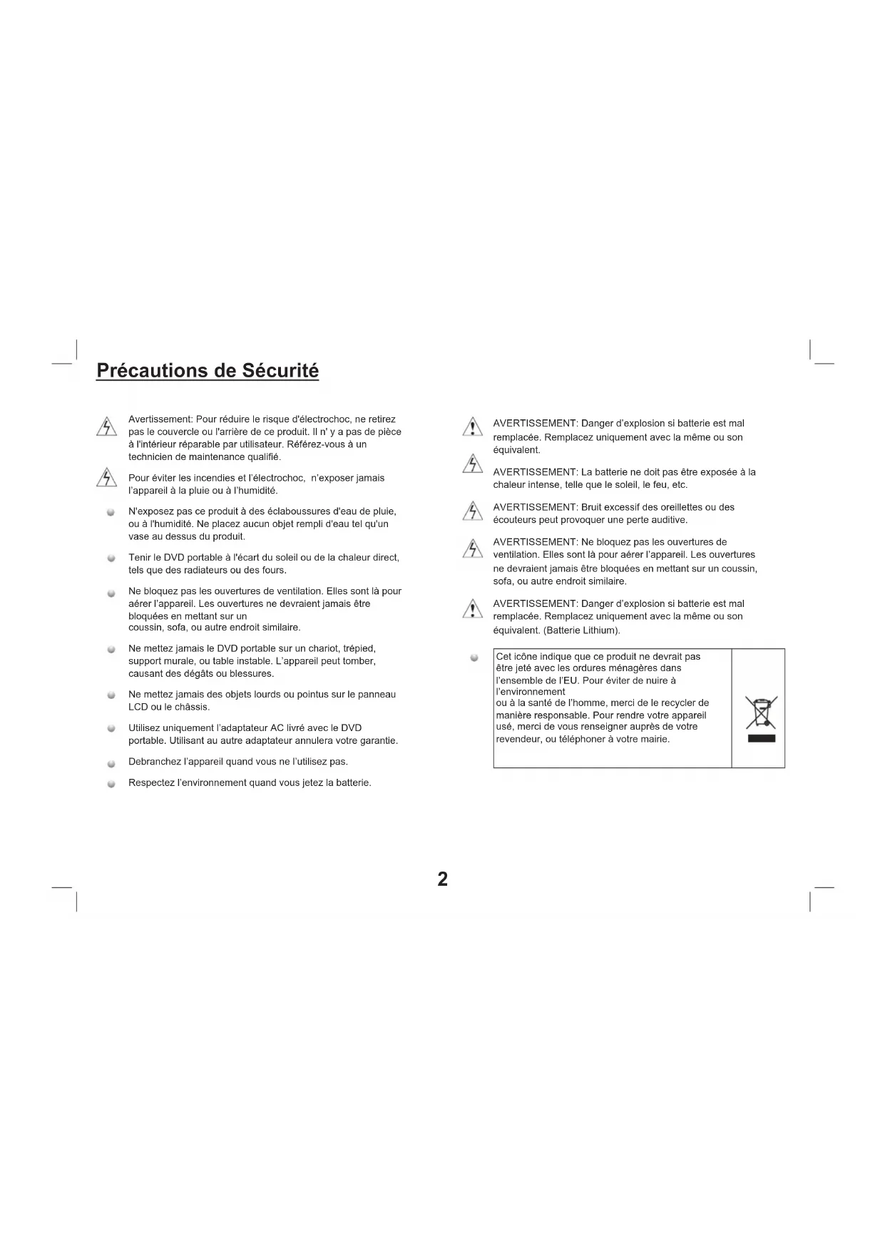 SDVD70301 Table des matières...................................................................P1 Précautions de sécurité.............................................................P3 Identification des commandes..............................................P4-P7 Unité principale...................................................................P4-P5 Télécommande....................................................................P6-P7 Paramètres de batterie............................................................P11 Paramètres et caractéristiques.................................................P11 Précautions de Sécurité..................................................................P2 Paramétrage du Menu CONFIGURATION...........................P8-P10 Table des matières Contenu Table des matièresAvertissement: Pour réduire le risque d'électrochoc, ne retirez pas le couvercle ou l'arrière de ce produit. Il n' y a pas de pièce à l'intérieur réparable par utilisateur. Référez-vous à un technicien de maintenance qualifié. Pour éviter les incendies et l’électrochoc, n’exposer jamais l’appareil à la pluie ou à l’humidité. N'exposez pas ce produit à des éclaboussures d'eau de pluie, ou à l'humidité. Ne placez aucun objet rempli d'eau tel qu'un vase au dessus du produit. Tenir le DVD portable à l'écart du soleil ou de la chaleur direct, tels que des radiateurs ou des fours. Ne bloquez pas les ouvertures de ventilation. Elles sont là pour aérer l’appareil. Les ouvertures ne devraient jamais être bloquées en mettant sur un coussin, sofa, ou autre endroit similaire. Ne mettez jamais le DVD portable sur un chariot, trépied, support murale, ou table instable. L’appareil peut tomber, causant des dégâts ou blessures. Ne mettez jamais des objets lourds ou pointus sur le panneau LCD ou le châssis. Utilisez uniquement l’adaptateur AC livré avec le DVD portable. Utilisant au autre adaptateur annulera votre garantie. Debranchez l’appareil quand vous ne l’utilisez pas. Respectez l’environnement quand vous jetez la batterie. Cet icône indique que ce produit ne devrait pas être jeté avec les ordures ménagères dans l’ensemble de l’EU. Pour éviter de nuire à l’environnement ou à la santé de l’homme, merci de le recycler de manière responsable. Pour rendre votre appareil usé, merci de vous renseigner auprès de votre revendeur, ou téléphoner à votre mairie.