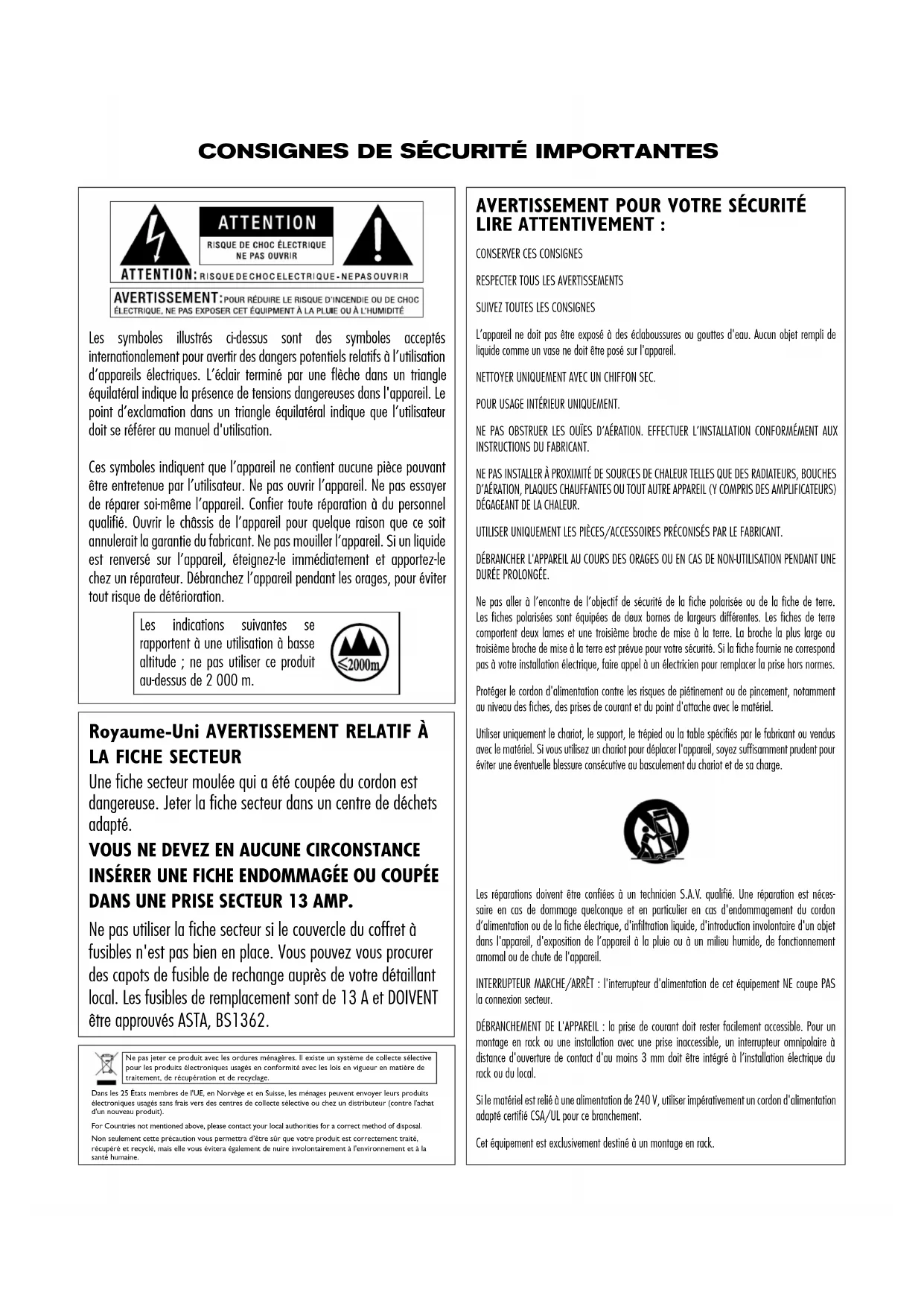 INSÉRER UNE FICHE ENDOMMAGÉE OU COUPÉE DANS UNE PRISE SECTEUR 13 AMP. Ne pas utiliser la fiche secteur si le couvercle du coffret à fusibles n'est pas bien en place. Vous pouvez vous procurer des capots de fusible de rechange auprès de votre détaillant local. Les fusibles de remplacement sont de 13 A et DOIVENT être approuvés ASTA, BS1362. Ne pas jeter ce produit avec les ordures ménagères. Il existe un système de collecte sélective pour les produits électroniques usagés en conformité avec les lois en vigueur en matière de traitement, de récupération et de recyclage. Dans les 25 États membres de l'UE, en Norvège et en Suisse, les ménages peuvent envoyer leurs produits électroniques usagés sans frais vers des centres de collecte sélective ou chez un distributeur (contre l'achat d'un nouveau produit). For Countries not mentioned above, please contact your local authorities for a correct method of disposal. Non seulement cette précaution vous permettra d’être sûr que votre produit est correctement traité, récupéré et recyclé, mais elle vous évitera également de nuire involontairement à l'environnement et à la santé humaine. Les symboles illustrés ci-dessus sont des symboles acceptés internationalement pour avertir des dangers potentiels relatifs à l’utilisation d’appareils électriques. L’éclair terminé par une flèche dans un triangle équilatéral indique la présence de tensions dangereuses dans l'appareil. Le point d’exclamation dans un triangle équilatéral indique que l’utilisateur doit se référer au manuel d'utilisation. Ces symboles indiquent que l’appareil ne contient aucune pièce pouvant être entretenue par l’utilisateur. Ne pas ouvrir l’appareil. Ne pas essayer de réparer soi-même l’appareil. Confier toute réparation à du personnel qualifié. Ouvrir le châssis de l’appareil pour quelque raison que ce soit annulerait la garantie du fabricant. Ne pas mouiller l’appareil. Si un liquide est renversé sur l’appareil, éteignez-le immédiatement et apportez-le chez un réparateur. Débranchez l’appareil pendant les orages, pour éviter tout risque de détérioration. Les indications suivantes se rapportent à une utilisation à basse altitude ; ne pas utiliser ce produit au-dessus de 2 000 m.