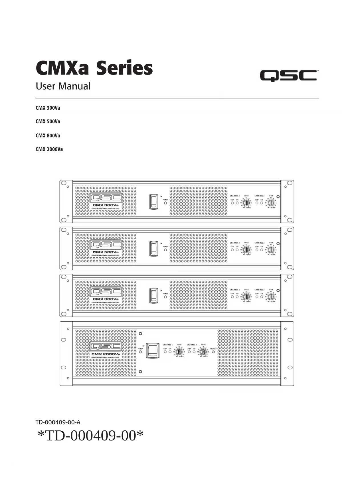 75 lb (34 kg) 87 lb (39.5 kg) Les spécifications sont sujettes à modification sans préavis.Adresse : QSC Audio Products, LLC 1675 MacArthur Boulevard Costa Mesa, CA 92626-1468, États-Unis Téléphone : Standard : (714) 754-6175 Ventes & Marketing : (714) 957-7100 ou numéro vert (États-Unis seulement) (800) 854-4079 Service clientèle : (714) 957-7150 ou numéro vert (États-Unis seulement) (800) 772-2834 Télécopieur : Fax Ventes & Marketing : (714) 754-6174 Fax Service clientèle : (714) 754-6173 Site Web : www.qsc.com E-mail : info@qsc.com service@qsc.com © 2013 QSC Audio Products, LLC. Tous droits réservés. QSC™ et le logo QSC sont des marques de QSC Audio Products, LLC. Toutes les autres marques de commerce appartiennent à leur propriétaire respectif. Brevets instance.Serie CMXa Benutzerhandbuch CMX 300Va CMX 500Va CMX 800Va CMX 2000Va2