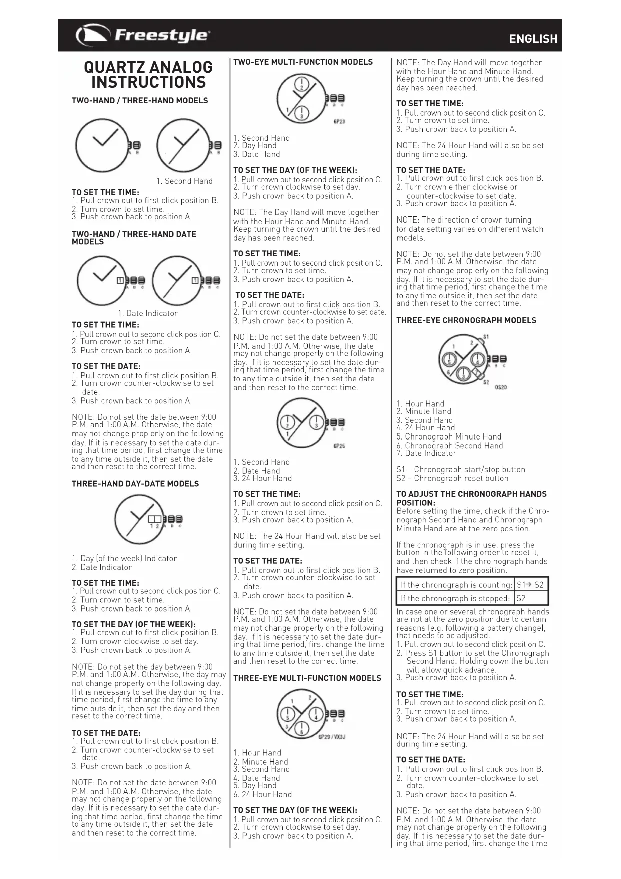FENETRES 1.Aiguilledesheures 2.Aiguilledesminutes 3.Trotteuse 4.Aiguilledeladate 5.Aiguilledujour 6.Aiguille24heures REGLAGE DU JOUR (DE LA SEMAINE): 1.Tirezsurlacouronnejusqu’au deuxièmedéclicpourlamettreen positionC. 2.Tournezlacouronnedanslesensdes aiguillesd’unemontrepourrégler lejour. 3.Enfoncezlacouronnepourlaremettre enpositionApourconrmer. REMARQUE:L’aiguilledujourtournera danslemêmesensquel’aiguilledes heuresetl’aiguilledesminutes.Tournez lacouronnejusqu’àcequelejourdesiré soitatteint. REGLAGE DE L’HEURE : 1.Tirezsurlacouronnejusqu’au deuxièmedéclicpourlamettreen positionC. 2.Tournezlacouronnepourrégler l’heure. 3.Enfoncezlacouronnepourlaremettre enpositionApourconrmer. REMARQUE:L’aiguille24Heuressera égalementrégléedurantleréglagede l’heure. REGLAGE DE LA DATE: 1.Tirezsurlacouronnejusqu’aupremier déclicpourlamettreenpositionB. 2.Tournezlacouronnedanslesensdes aiguillesd’unemontreoucontraire pourréglerladate.Pourréduirel’émissiondecarbone dansl’atmosphère,cesinstructions Freestylesontimpriméesavecdes encresdesojasurdupapierrecyclé. FRANÇAIS 3.Enfoncezlacouronnepourlaremettre enpositionApourconrmer. REMARQUE:Lesensderotationutilisé pourréglerladatevarieselonles différentsmodèlesdemontre. REMARQUE:Neréglezpasladate lorsqu’ilestentre21:00et1:00. Autrement,ladatepourranepasse changercorrectementlejoursuivant. S’ilestnécessairedechangerladate durantcettetranchehoraire,changez toutd’abordl’heureàuneheureautre quedanscettetranchehoraire,puis réglezladateetréglezdenouveaul’heure correcte.