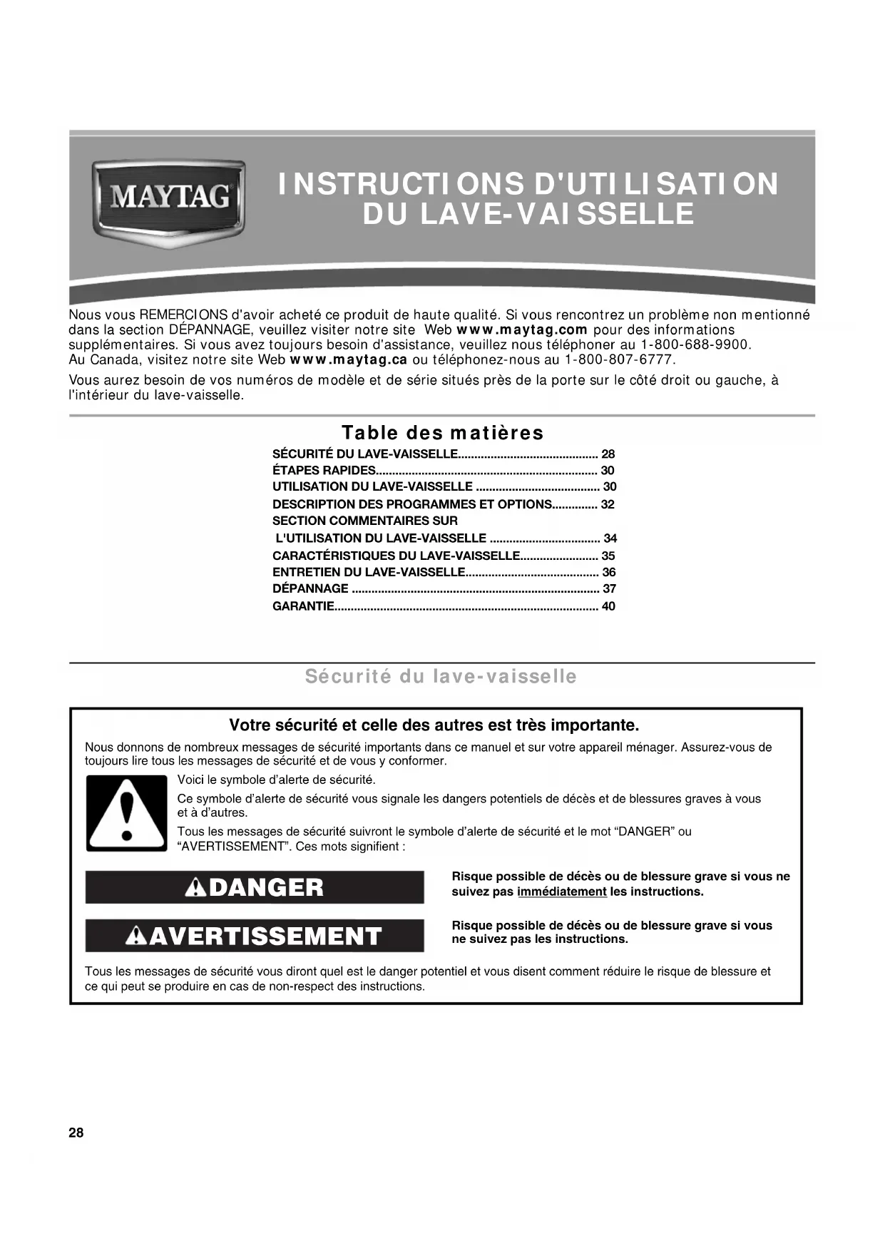 - Mississauga, Ontario L5N 0B7 Por favor incluya en su correspondencia un número de teléfono en el que se le pueda localizar durante el día. Sírvase guardar estas Instrucciones para el usuario y la información con el número de modelo, para referencia futura. W10596271A ® /™ © 2013 Maytag. Usada en Canadá bajo licencia. Todos los derechos resrvados. 5/13 Impreso en EE.UU.28 Nous vous REMERCIONS d'avoir acheté ce produit de haute qualité. Si vous rencontrez un problème non mentionné dans la section DÉPANNAGE, veuillez visiter notre site Web www.maytag.com pour des informations supplémentaires. Si vous avez toujours besoin d'assistance, veuillez nous téléphoner au 1-800-688-9900. Au Canada, visitez notre site Web www.maytag.ca ou téléphonez-nous au 1-800-807-6777. Vous aurez besoin de vos numéros de modèle et de série situés près de la porte sur le côté droit ou gauche, à l'intérieur du lave-vaisselle. Sécurité du lave-vaisselle INSTRUCTIONS D'UTILISATION DU LAVE-VAISSELLE Table des matières SÉCURITÉ DU LAVE-VAISSELLE p. 28