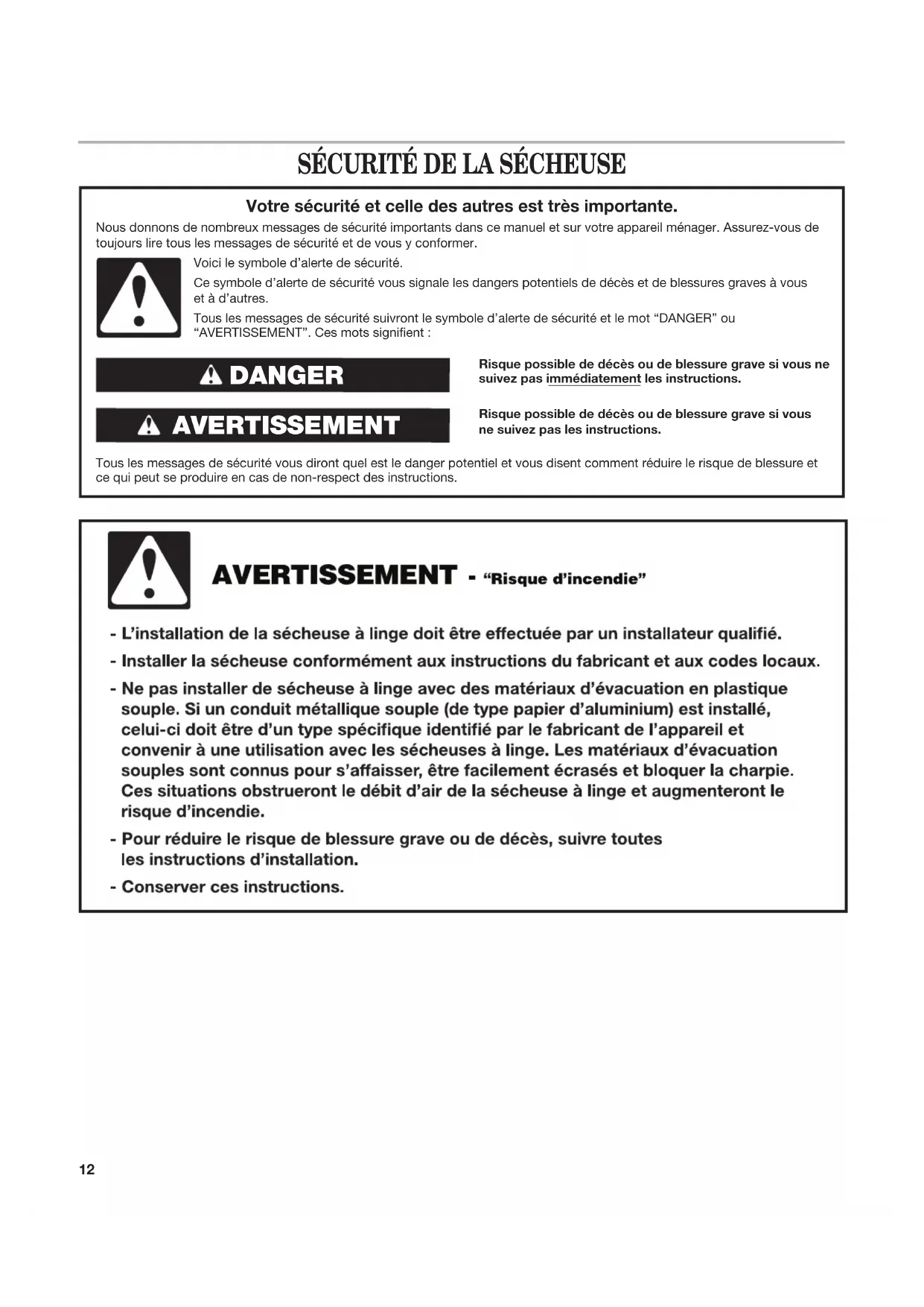 Lire toutes les instructions avant d'utiliser la sécheuse. Ne pas placer des articles exposés aux huiles de cuisson dans votre sécheuse. Les articles contaminés par des huiles de cuisson peuvent contribuer à une réaction chimique qui pourrait causer à la charge de s'enammer. Ne pas faire sécher dans la machine des articles qui ont déjà été nettoyés, lavés, imbibés, ou tachés d'essence, de solvants pour nettoyage à sec, d'autres substances inammables, ou de substances explosives puisqu'elles dégagent des vapeurs qui peuvent provoquer un incendie ou une explosion. Ne pas permettre à des enfants de jouer sur ou à l'intérieur de la sécheuse. Une surveillance étroite est nécessaire lorsque la sécheuse est utilisée près d'eux. Avant d'enlever la sécheuse du service ou la jeter, enlever la porte du compartiment de séchage.