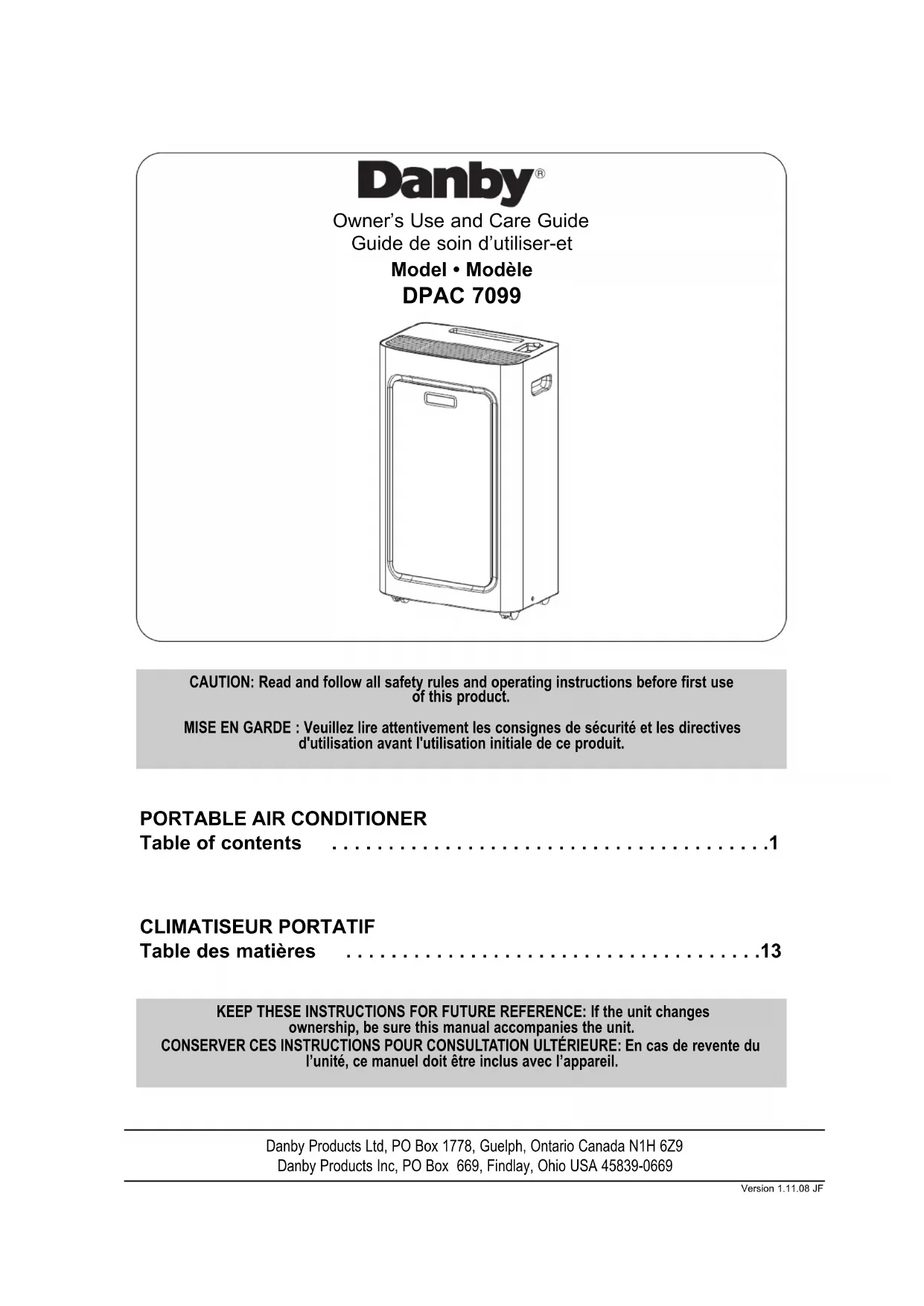 TABLE DES MATIÈRESMerci d’avoir choisi un appareil Danby qui vous fournira ainsi qu’à votre famille, le confort au foyer, à la maison, au chalet ou au bureau. Ce manuel d’utilisation vous offre des renseignements pratiques pour le soin et l’entretien de votre nouvel appareil. Un appareil Danby bien entretenu vous fournira plusieurs années de service sans ennui. Veuillez prendre quelques moments pour lire attentivement toutes les directives pour vous renseigner et vous familiariser avec tous les aspects du fonctionnement de votre appareil. Votre climatiseur portable Danby est un appareil d’échange et de traitement de l’air à fonctions multiples. Sa conception vous offre les fonctions suivantes: la climatisation, la déshumidification et la ventilation indépendante. Chacun des modes est équipé d’une capacité de balayage de l’air par oscillation. Cet appareil peut être aisément déplacé d’une pièce à l’autre de la maison et il est installé en quelques minutes seulement. Imaginez la commodité du confort au foyer 3 saisons à portée de la main, en tout temps, en tout lieu. Pour la référence aisée, nous vous suggérons de joindre une copie de votre reçu de caisse et/ou facture d’achat à cette page, et d’inscrire les renseignements suivants qui sont trouvés sur la plaque d’identification du fabricant. Celle-ci est située sur le panneau arrière de l’appareil. Numéro de modèle: Numéro de série : Date d’achat : Ces renseignements seront requis si le service est demandé et/ou si vous désirez obtenir des renseignements supplémentaires. Pour consulter un Représentant du service à la clientèle, composez le NUMÉRO D’APPEL SANS FRAIS suivant: 1-800-26- (1-800-263-2629) Spécifications de l’unité Numero de modèle DPAC7099 Source d’alimentation 115V-60Hz Niveau de bruit 47 dB Vitesse de le ventilateur 3 Capacité de climatisation 7000BTU Réfrigérant R-410A Poids de l’unité 24.5 kg (54lb) Dimensions (lgr) x (pfdr) x (htr)(pouces) 17.3 x 12 x 27.2 télécommande Oui horloge Non minuterie automatique Oui REMARQUE: La recherche ensuit toujours des améliorations. Par conséquent, ces informations et spécifications peuvent changer sans préavis.