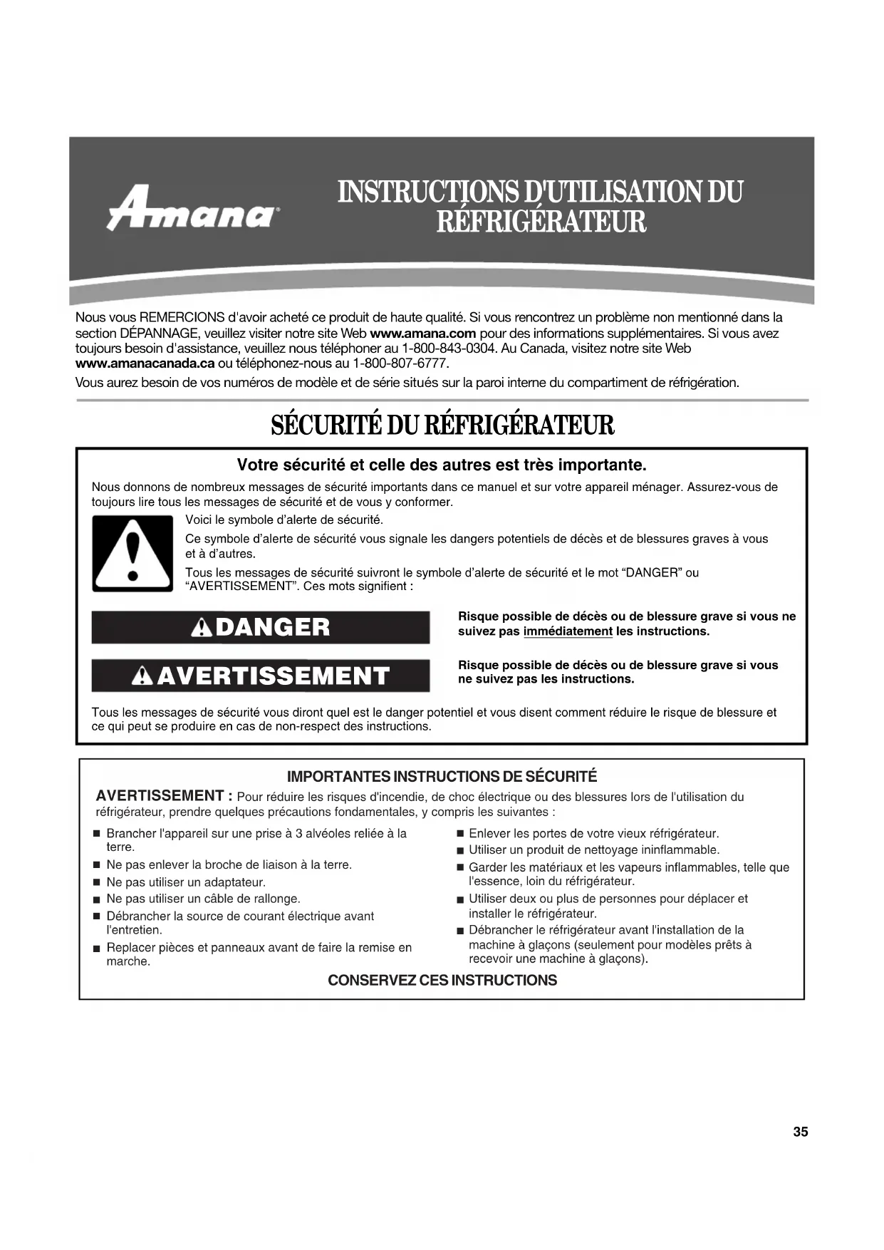 CLAUSE D'EXONÉRATION DE RESPONSABILITÉ AU TITRE DES GARANTIES IMPLICITES LES GARANTIES IMPLICITES, Y COMPRIS LES GARANTIES APPLICABLES DE QUALITÉ MARCHANDE OU D'APTITUDE À UN USAGE PARTICULIER, SONT LIMITÉES À UN AN OU À LA PLUS COURTE PÉRIODE AUTORISÉE PAR LA LOI. Certains États et provinces ne permettent pas de limitation sur la durée d’une garantie implicite de qualité marchande ou d'aptitude à un usage particulier, de sorte que la limitation ci-dessus peut ne pas être applicables dans votre cas. Cette garantie vous confère des droits juridiques spécifiques, et vous pouvez également jouir d’autres droits qui peuvent varier d’une juridiction à l'autre. LIMITATION DES RECOURS; EXCLUSION DES DOMMAGES FORTUITS OU INDIRECTS LE SEUL ET EXCLUSIF RECOURS DU CLIENT DANS LE CADRE DE LA PRÉSENTE GARANTIE LIMITÉE CONSISTE EN LA RÉPARATION PRÉVUE CI-DESSUS. AMANA N’ASSUME AUCUNE RESPONSABILITÉ POUR LES DOMMAGES FORTUITS OU INDIRECTS. Certains États et certaines provinces ne permettent pas l’exclusion ou la limitation des dommages fortuits ou indirects, de sorte que ces limitations et exclusions peuvent ne pas être applicable dans votre cas. Cette garantie vous confère des droits juridiques spécifiques, et vous pouvez également jouir d’autres droits qui peuvent varier d’une juridiction à l'autre. Si vous résidez à l'extérieur des 50 États des États-Unis et du Canada, contactez votre marchand Amana autorisé pour déterminer si une autre garantie s'applique. 6/08Pour des informations supplémentaires sur le produit, aux É.-U., visiter www.amana.com. Au Canada, visiter www.amanacanada.ca. Si vous n’avez pas accès à Internet et que vous nécessitez une assistance pendant l’utilisation du produit ou que vous souhaitez prendre un rendez-vous, vous pouvez contacter Amana au numéro ci-dessous. Ayez votre numéro de modèle à disposition. Vous pouvez trouver vos numéros de modèle et de série sur la plaque située sur la paroi interne du compartiment de réfrigération. Pour assistance ou service aux É.-U., composez le 1-800-843-0304. Au Canada, composez le 1-800-807-6777. Si vous avez besoin de plus d’assistance, vous pouvez écrire à Amana en soumettant toute question ou problème à l’adresse suivante : Aux États-Unis : Amana Brand Home Appliances Customer eXperience Center 553 Benson Road Benton Harbor, MI 49022-2692 Au Canada : Amana Brand Home Appliances Centre d'eXpérience à la clientèle 200 – 6750 Century Ave. Mississauga, Ontario L5N 0B7 Dans votre correspondance, veuillez indiquer un numéro de téléphone où l’on peut vous joindre dans la journée. Veuillez conserver le manuel de l’utilisateur et le numéro de modèle pour référence ultérieure. W10359301A EN/FR PN W10359280A © 2011 All rights reserved. Todos los derechos reservados. Tous droits réservés.