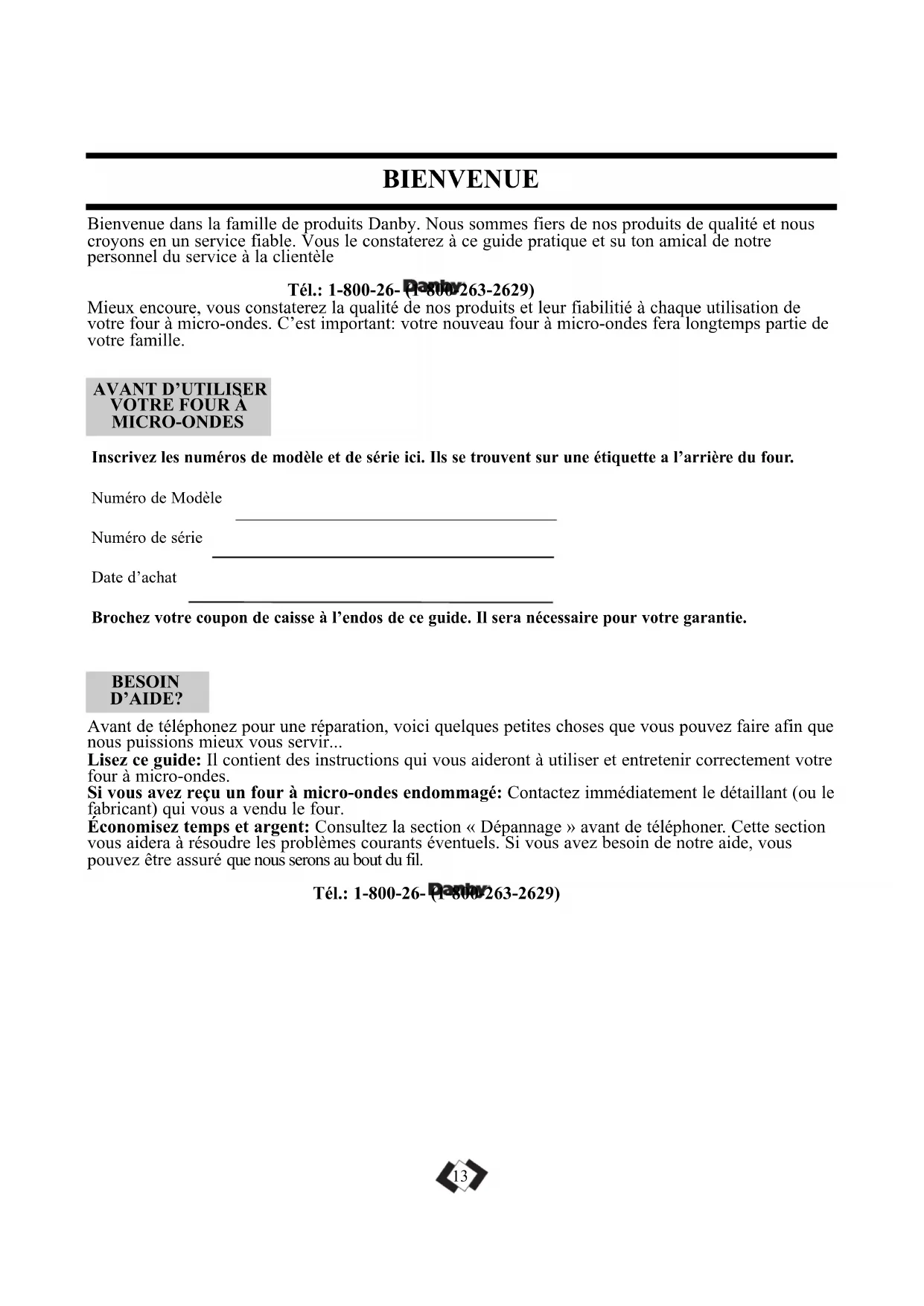 abrasive soaps or detergents applied with a sponge or soft cloth. CARE AND MAINTENANCEInscrivez les numéros de modèle et de série ici. Ils se trouvent sur une étiquette a l’arrière du four. Numéro de Modèle Numéro de série Date d’achat Brochez votre coupon de caisse à l’endos de ce guide. Il sera nécessaire pour votre garantie. BIENVENUE Bienvenue dans la famille de produits Danby. Nous sommes fiers de nos produits de qualité et nous croyons en un service fiable. Vous le constaterez à ce guide pratique et su ton amical de notre personnel du service à la clientèle Tél.: 1-800-26- (1-800-263-2629) Mieux encoure, vous constaterez la qualité de nos produits et leur fiabilitié à chaque utilisation de votre four à micro-ondes. C’est important: votre nouveau four à micro-ondes fera longtemps partie de votre famille.