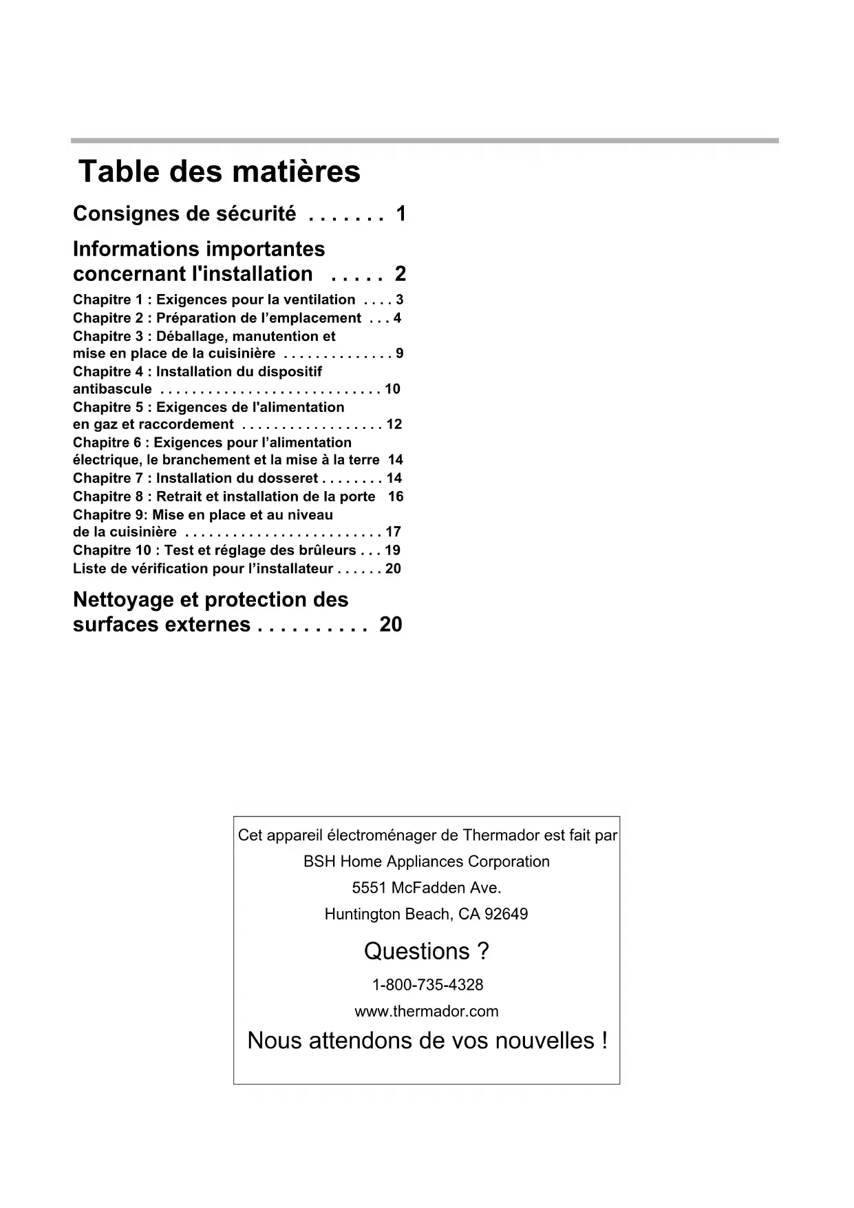 - Les grilles des brûleurs sont bien placées, nivelées et ne bougent pas. Nettoyage et protection des surfaces externes Les surfaces en acier inoxydable se nettoient en passant un chiffon mouillé à l’eau savonneuse. Rincez à l’eau claire puis séchez avec un chiffon sec pour éviter les traces d’eau. Retirez les traces de doigts et les traînées avec un produit à vitres doux. En cas de décoloration ou de tache persistante, consultez le Manuel d’utilisation et d’entretien. Pour faire briller et protéger l’acier inoxydable, utilisez un produit nettoyant ou un poli comme Stainless Steel Magic®. NE laissez PAS les taches s’incruster. N’utilisez PAS de tampons ni de brosses métalliques. De petits morceaux de métal risquent d’adhérer à la surface et de la faire rouiller. NE laissez PAS les solutions salines, les désinfectants, l’eau de Javel ou les produits de nettoyage en contact avec l’acier inoxydable. Ces produits contiennent en général des produits chimiques susceptibles de l’endommager. Rincez- les à l’eau puis séchez avec un chiffon sec.Contenidos ¿Preguntas? 1-800-735-4328 www.thermador.com ¡Esparamos oir de usted! Este electrodomestico de Thermador es hecho por BSH Home Appliances Corporation 5551 McFadden Ave. Huntington Beach, CA 92649 Instrucciones de seguridad . . . 1 Información importante de instalación . . . . . . . . . . . . . . . . . 2 Paso 1: Requisitos de ventilación . . . . . . . . . . . 3 Paso 2: Preparación de gabinetes . . . . . . . . . . 4 Paso 3: Desembalaje y traslado de la estufa . . 9 Paso 4: Instalación del dispositivo antivuelco 10 Paso 5: Requisitos de gas y conexiones . . . . 12 Paso 6: Paso 6: Requisitos eléctricos, conexión y puesta a tierra . . . . . . . . . . . . . . . . 14 Paso 7: Instalación del protector trasero . . . . 14 Paso 8: Desmontaje y reinstalación de la puerta . . . . . . . . . . . . . . . . . . . . . . . . . . . . 16 Paso 9: Colocación y nivelado de la estufa . . 17 Paso 10: Pruebas y ajustes de los quemadores . . . . . . . . . . . . . . . . . . . . . . . . . . . 19 Lista de chequeo del instalador . . . . . . . . . . . 20 Para limpiar y proteger las superficies exteriores . . . . . . 20Español 1 Instrucciones de seguridad Instrucciones de seguridad importantes LEA TODAS LAS INSTRUCCIONES ANTES DE CONTINUAR