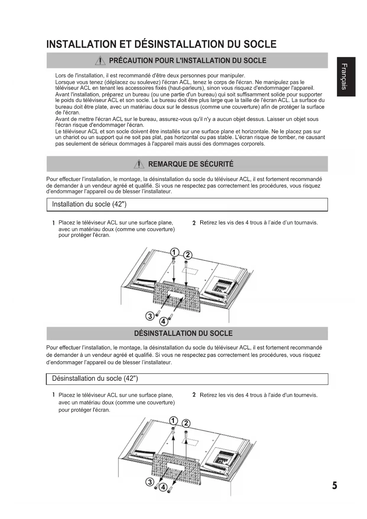 Pour effectuer l’installation, le montage, la désinstallation du socle du téléviseur ACL, il est fortement recommandé de demander à un vendeur agréé et qualifié. Si vous ne respectez pas correctement les procédures, vous risquez d’endommager l’appareil ou de blesser l’installateur. Installation du socle (42")