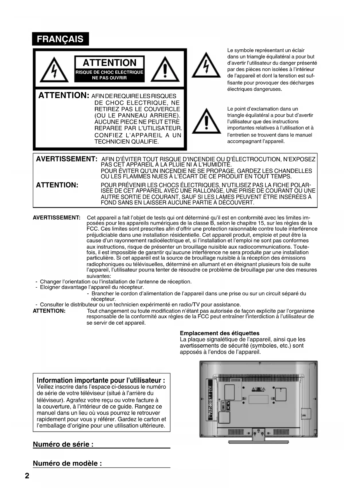 PAS CET APPAREIL À LA PLUIE NI À L’HUMIDITÉ.POUR ÉVITER QU’UN INCENDIE NE SE PROPAGE, GARDEZ LES CHANDELLES OU LES FLAMMES NUES À L’ÉCART DE CE PRODUIT EN TOUT TEMPS. ATTENTION: POUR PRÉVENIR LES CHOCS ÉLECTRIQUES, N’UTILISEZ PAS LA FICHE POLAR-ISÉE DE CET APPAREIL AVEC UNE RALLONGE, UNE PRISE DE COURANT OU UNE AUTRE SORTIE DE COURANT, SAUF SI LES LAMES PEUVENT ÉTRE INSÉRÉES À FOND SANS EN LAISSER AUCUNE PARTIE À DÉCOUVERT. Information importante pour l’utilisateur : Veillez inscrire dans l’espace ci-dessous le numéro de série de votre téléviseur (situé à l’arrière du téléviseur). Agrafez votre reçu ou votre facture à la couverture, à l’intérieur de ce guide. Rangez ce manuel dans un lieu où vous pourrez le retrouver rapidement pour vous y référer. Gardez le carton et l’emballage d’origine pour une utilisation ultérieure. Numéro de série : Numéro de modèle : 3CN0521A_fr.indd 23CN0521A_fr.indd 2 9/15/10 1:49:46 PM9/15/10 1:49:46 PM3 FRANÇAIS