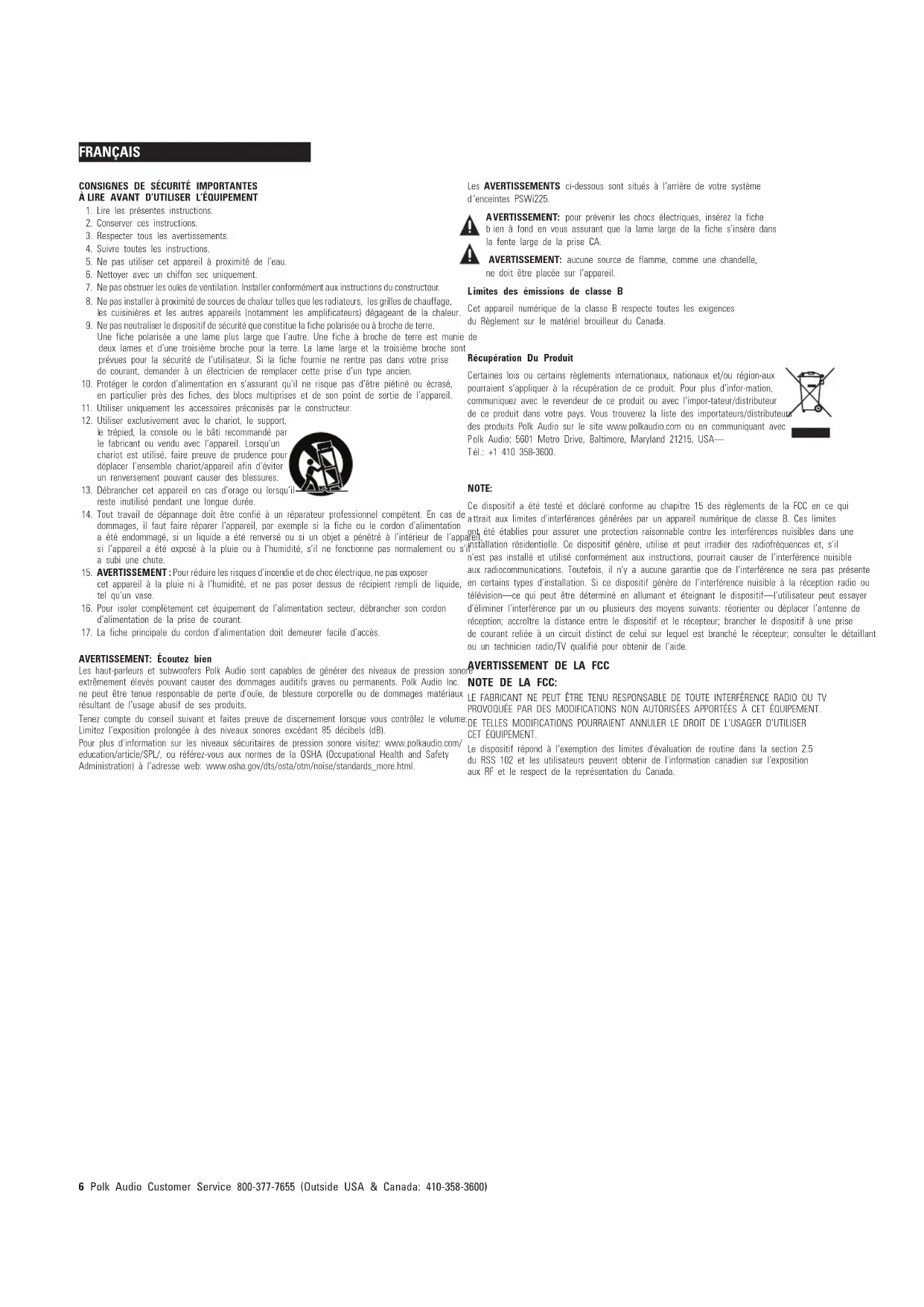 Les haut-parleurs et subwoofers Polk Audio sont capables de générer des niveaux de pression sonore extrêmement élevés pouvant causer des dommages auditifs graves ou permanents. Polk Audio Inc. ne peut être tenue responsable de perte d’ouïe, de blessure corporelle ou de dommages matériaux résultant de l’usage abusif de ses produits. Tenez compte du conseil suivant et faites preuve de discernement lorsque vous contrôlez le volume: Limitez l’exposition prolongée à des niveaux sonores excédant 85 décibels (dB). Pour plus d'information sur les niveaux sécuritaires de pression sonore visitez: www.polkaudio.com/ education/article/SPL/, ou référez-vous aux normes de la OSHA (Occupational Health and Safety Administration) à l’adresse web: www.osha.gov/dts/osta/otm/noise/standards_more.html. Les AVERTISSEMENTS ci-dessous sont situés à l’arrière de votre système