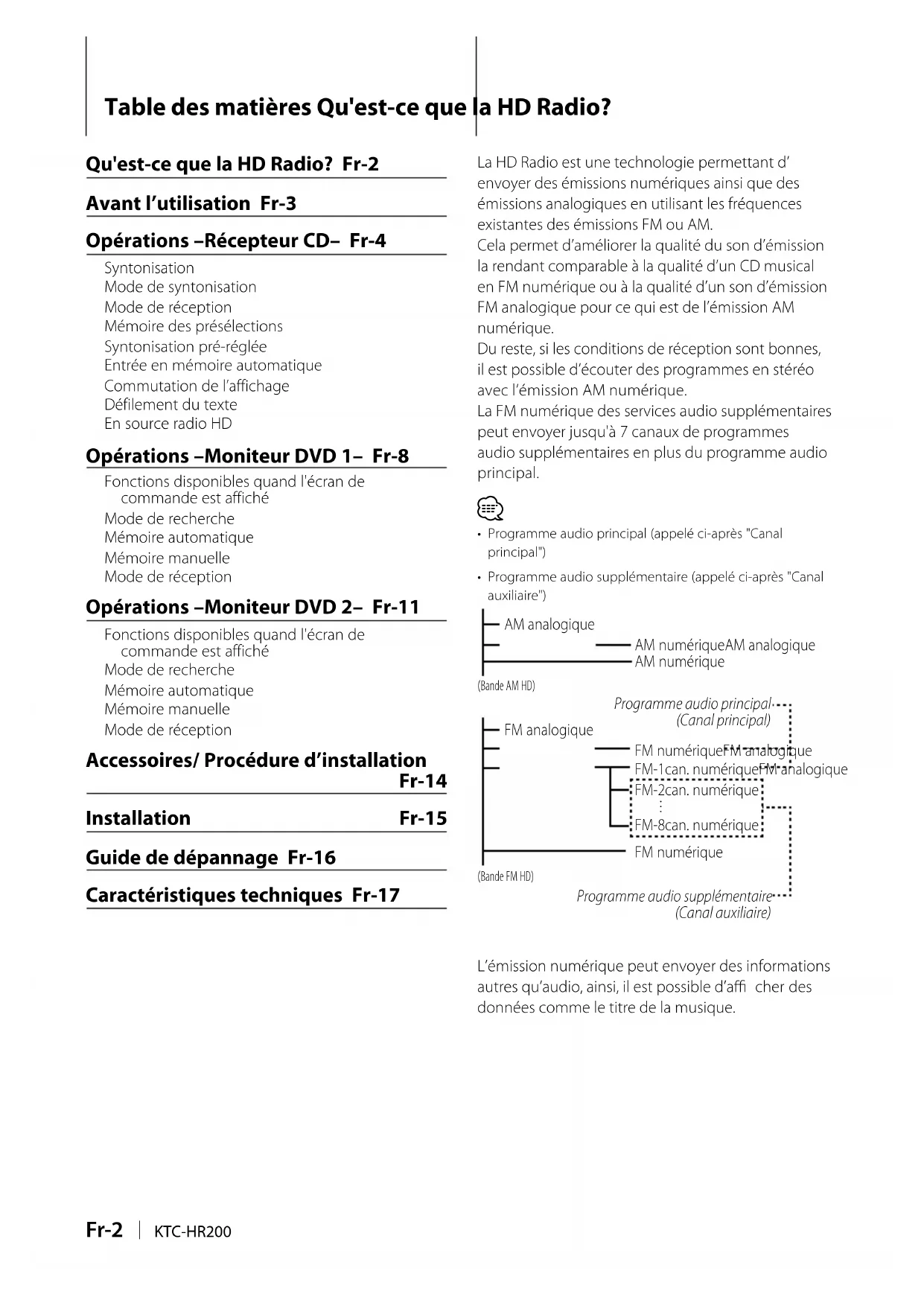 KTC-HR200 Table des matières Qu'est-ce que la HD Radio? La HD Radio est une technologie permettant d’ envoyer des émissions numériques ainsi que des émissions analogiques en utilisant les fréquences existantes des émissions FM ou AM. Cela permet d’améliorer la qualité du son d’émission la rendant comparable à la qualité d’un CD musical en FM numérique ou à la qualité d’un son d’émission FM analogique pour ce qui est de l’émission AM numérique. Du reste, si les conditions de réception sont bonnes, il est possible d’écouter des programmes en stéréo avec l’émission AM numérique. La FM numérique des services audio supplémentaires peut envoyer jusqu'à 7 canaux de programmes audio supplémentaires en plus du programme audio principal.