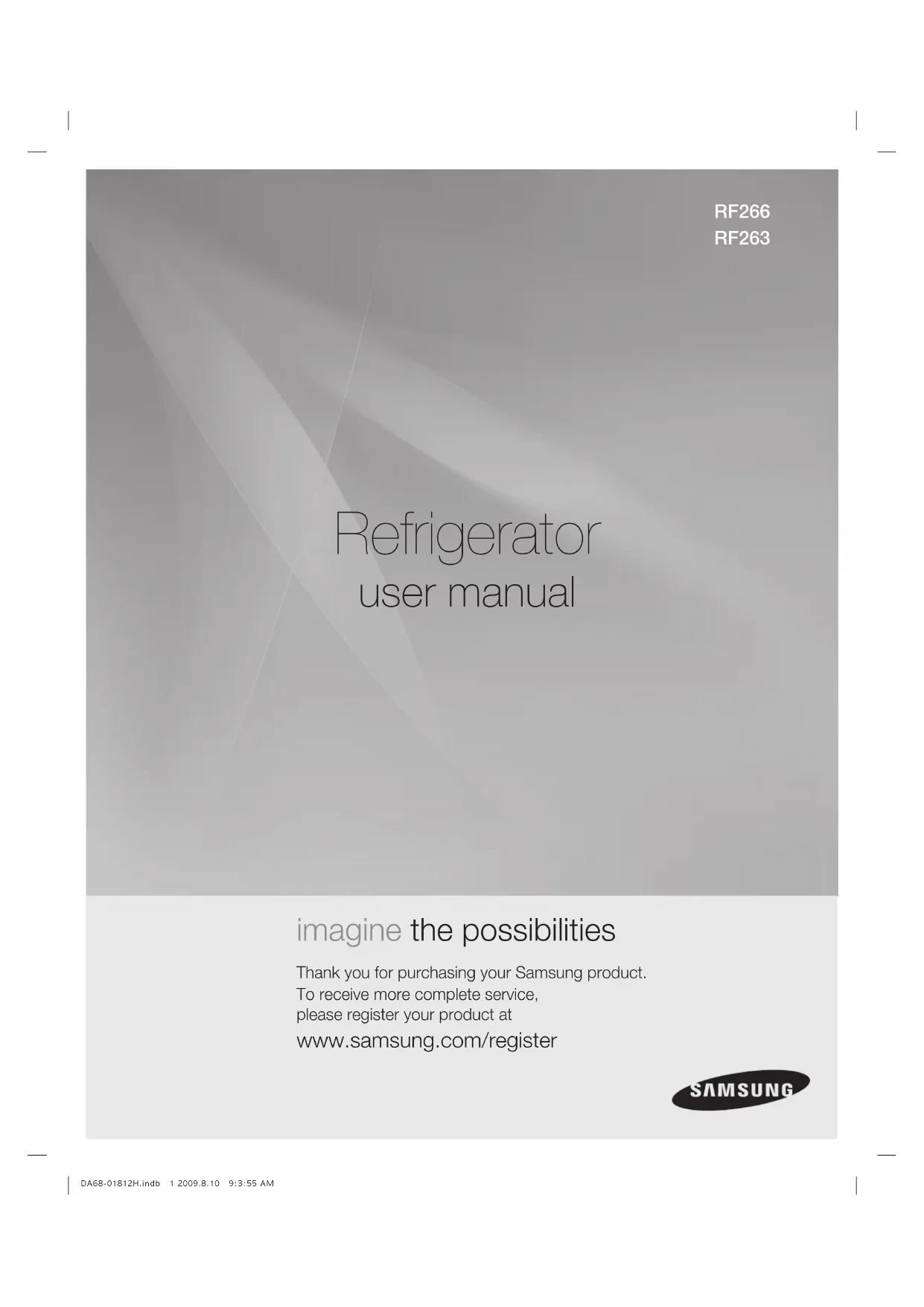 1-800-SAMSUNG (7267864) www.samsung.com/ca DA68-01812H.indb 38 2009.8.10 9:5:24 AMRéfrigérateur guide de l’utilisateur imaginer les possibilités Merci d’acheter ce produit Samsung. Pour recevoir un service plus complet, veuillez enregistrer votre produit à Enregistrez vos produits Samsung en vous connectant sur : www.samsung.com/register RF266 RF263 DA68-01812H.indb 1 2009.8.10 9:5:24 AMCaractéristiques de votre nouveau réfrigérateur